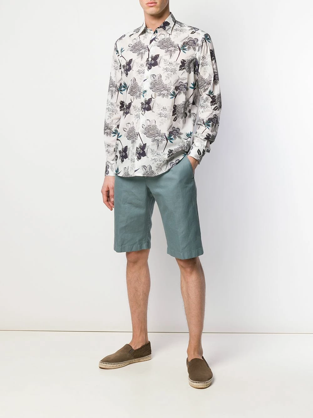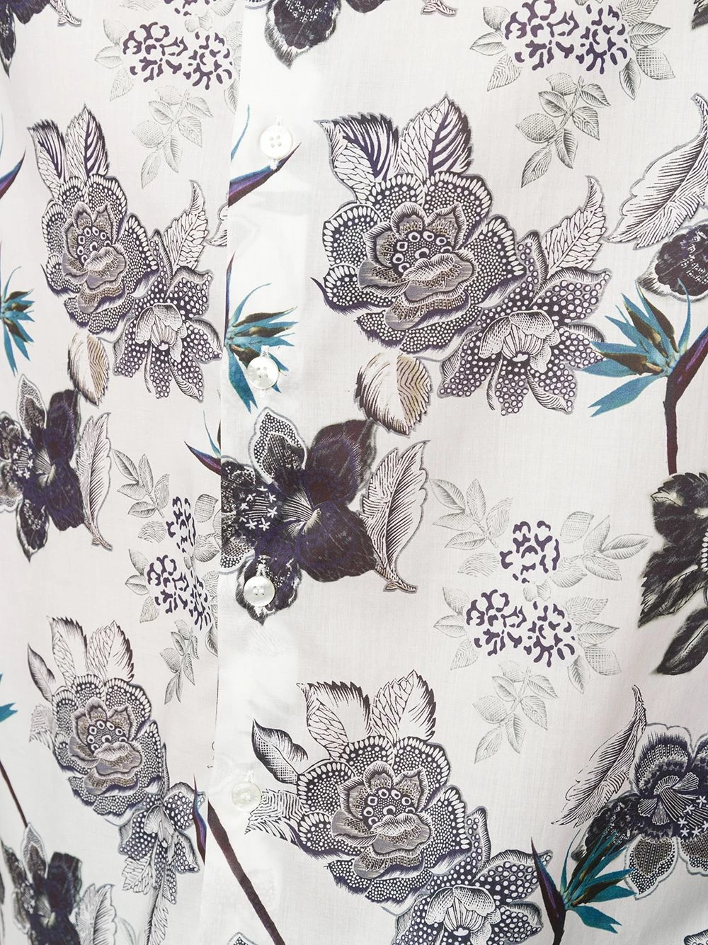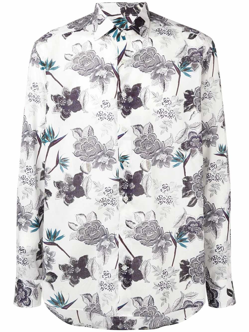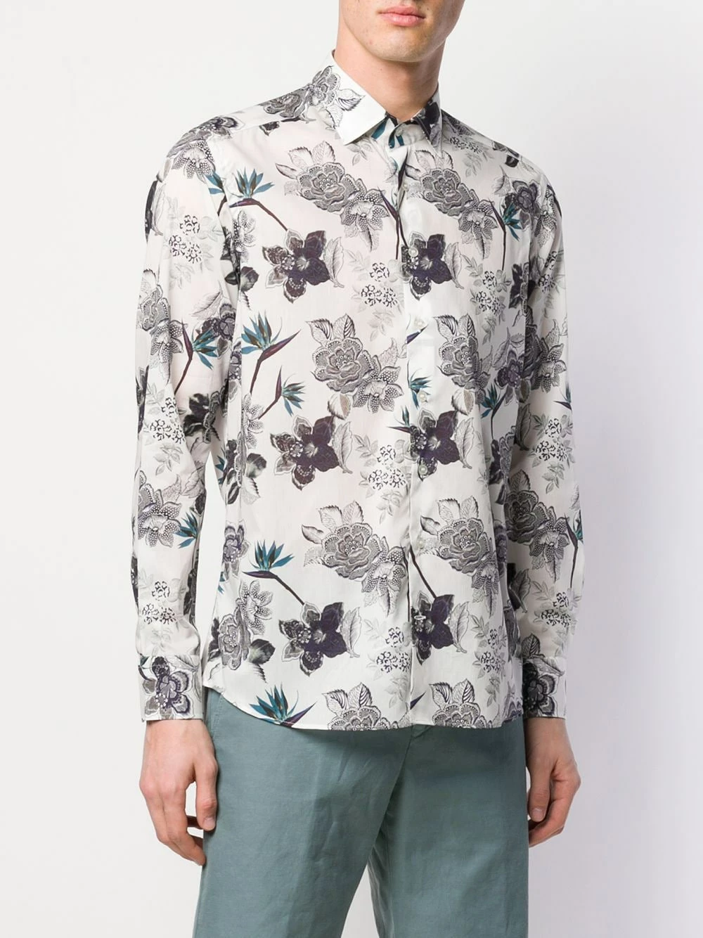Chemise à fleurs en coton Etro avec col classique, boutonnière sur le devant, ourlet incurvé, manches longues et poignets boutonnés. Couleur : blanc.