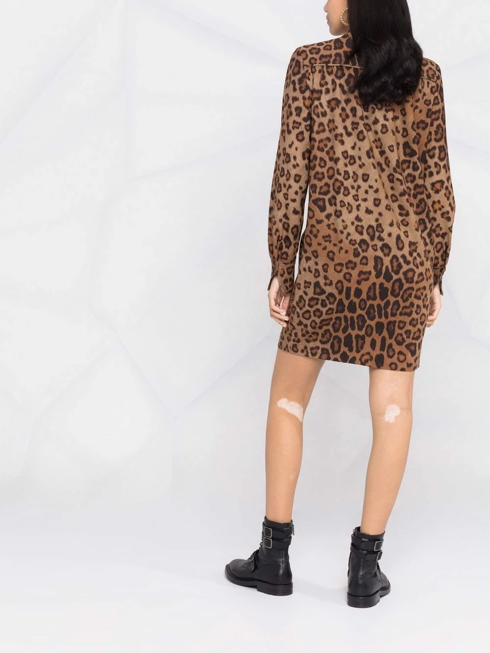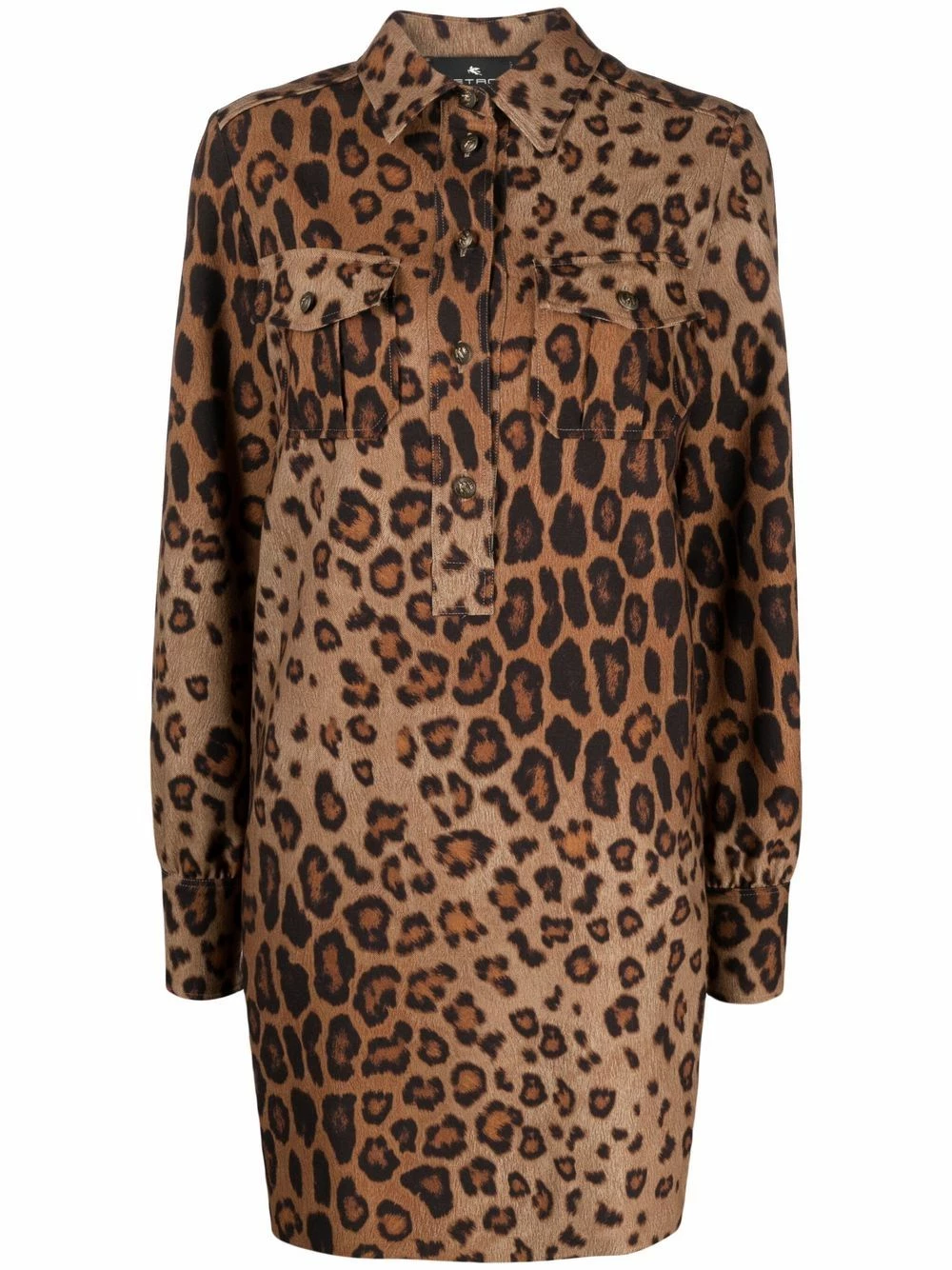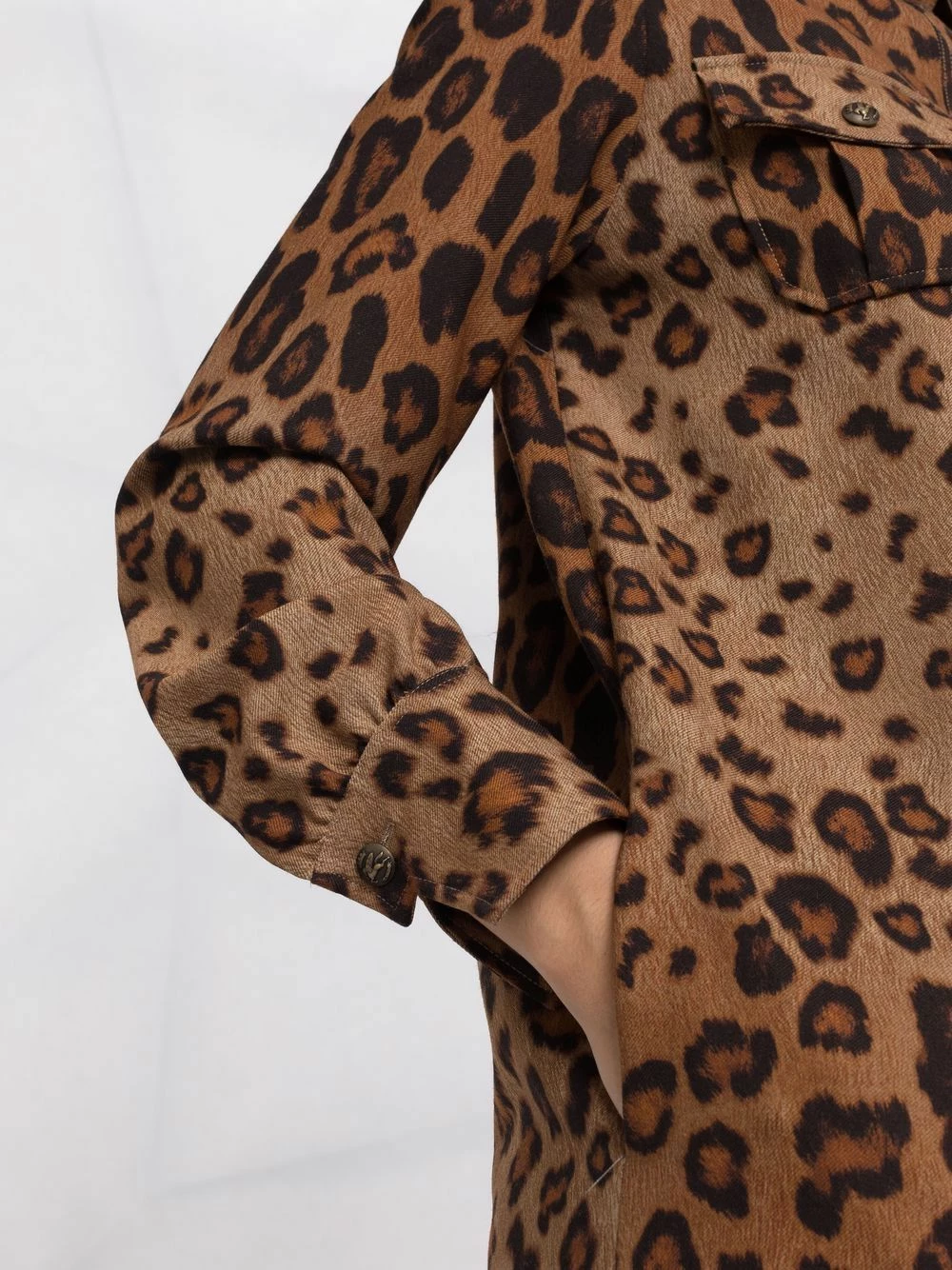 Construction stretch, design tricoté, imprimé léopard, col classique, boutonnière sur le devant, deux poches poitrine plaquées, manches à poignets boutonnés, longueur au dessus du genou.