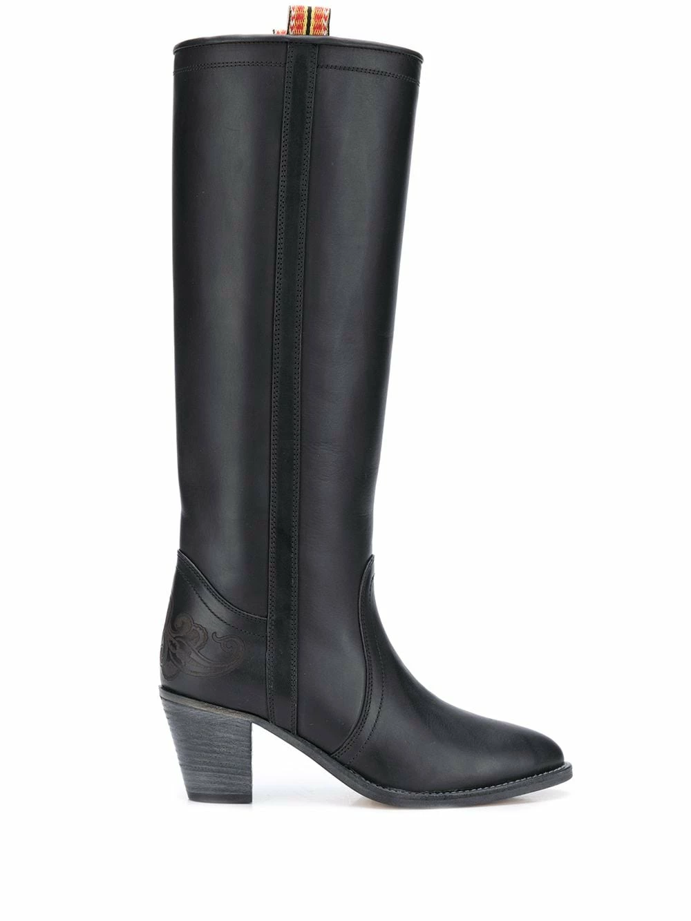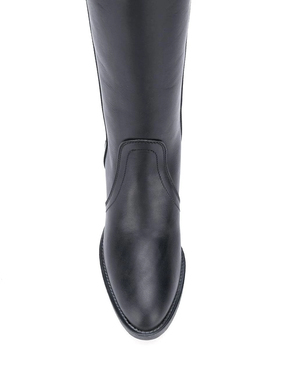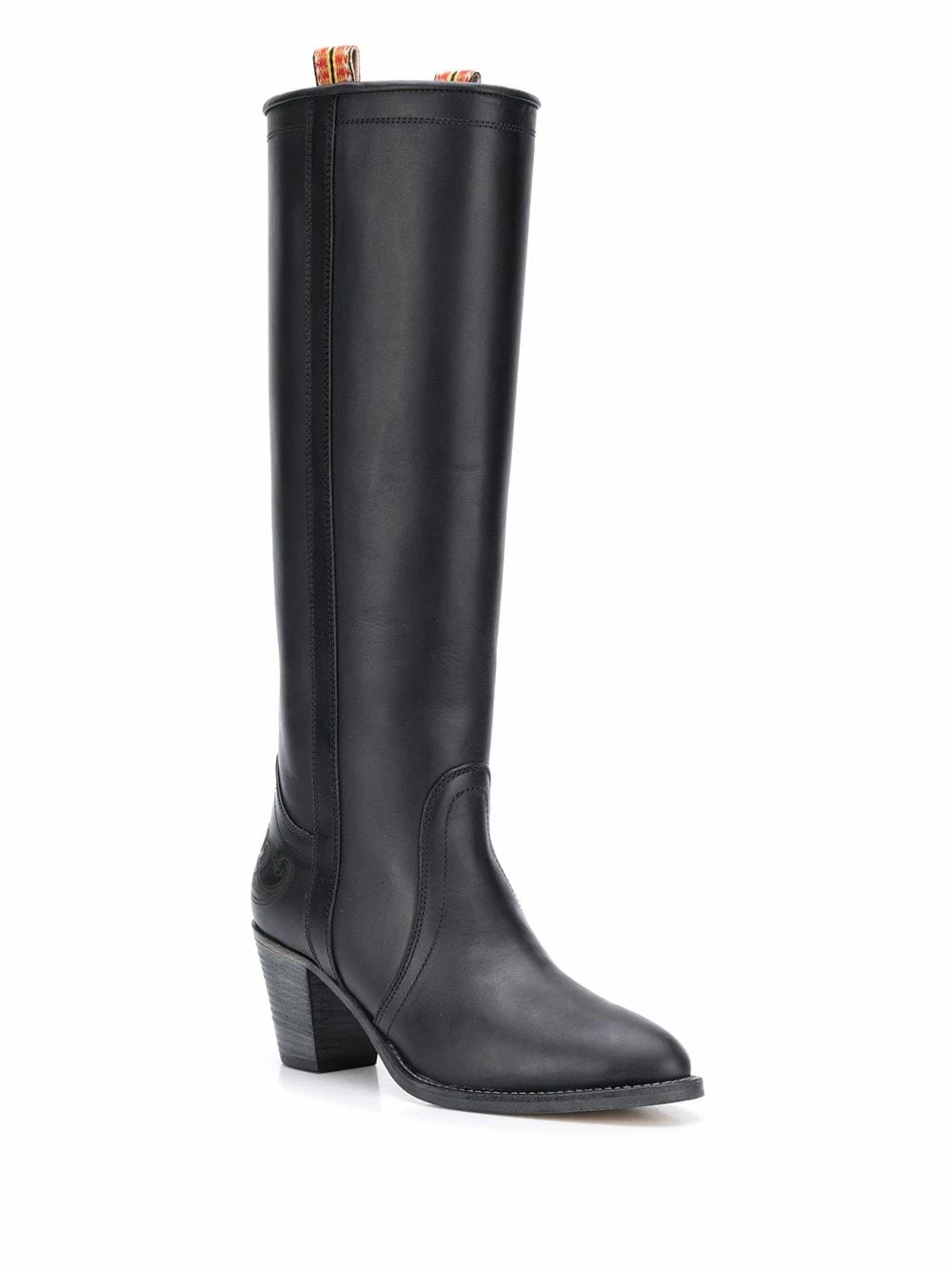 Design à enfiler, longueur genou, bout rond, talon mi-haut épais. Couleur : noir. Matière : cuir.