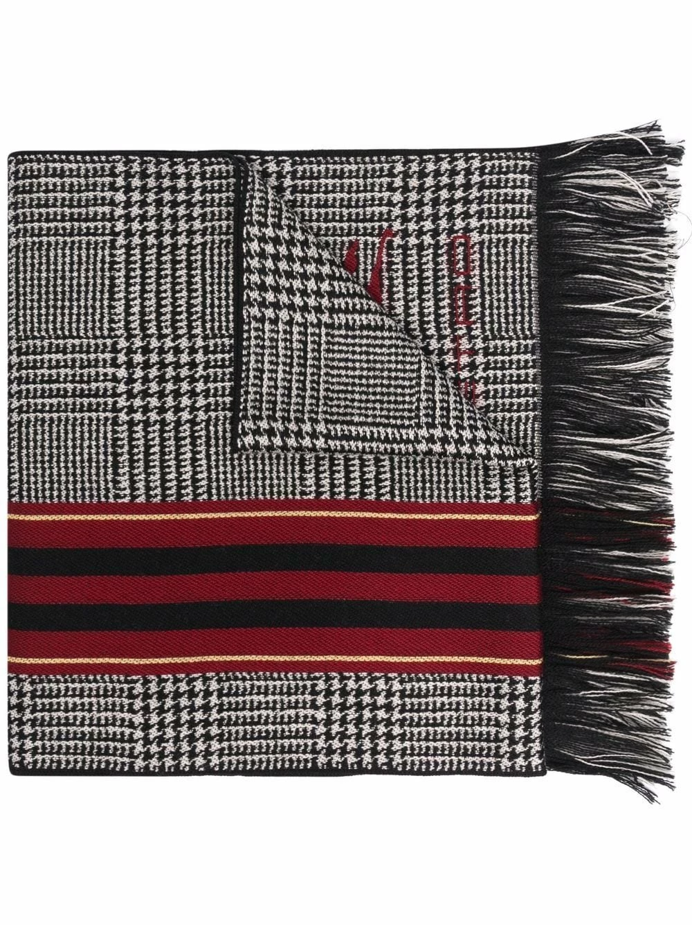 Carreaux, bordure à franges, logo brodé sur le côté. Matière : laine.