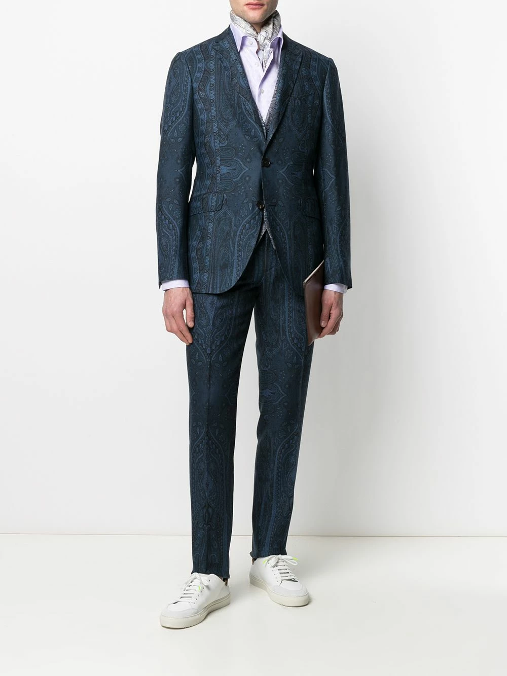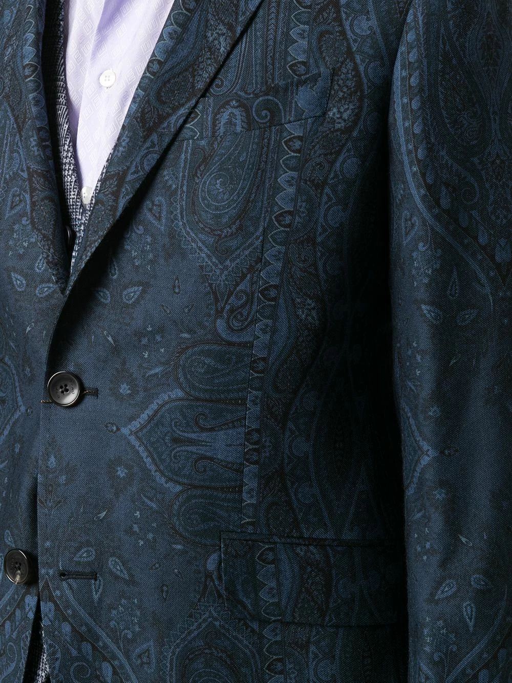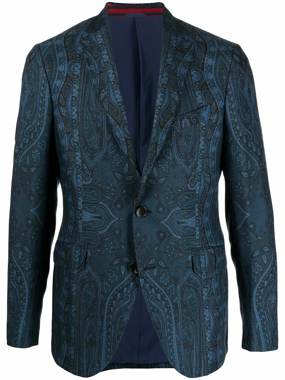 Motif cachemire, revers crantés étroits, boutonnière sur le devant, manches longues, poignets boutonnés, double fente arrière.