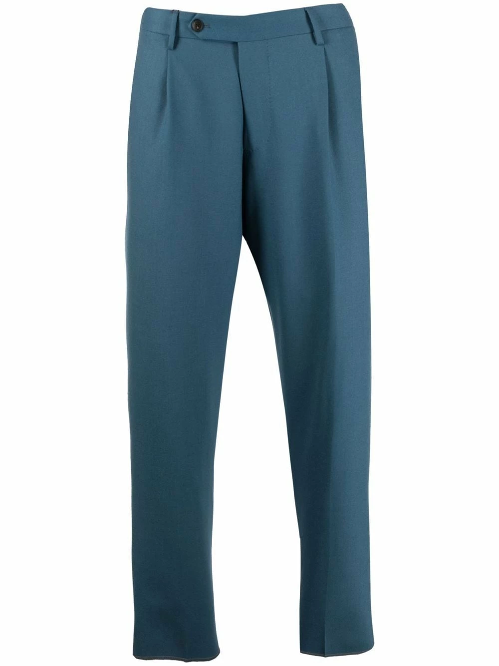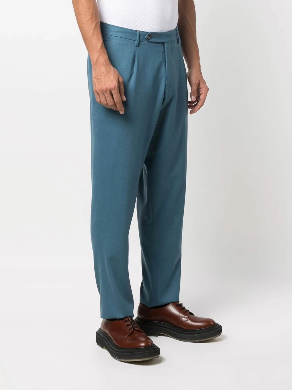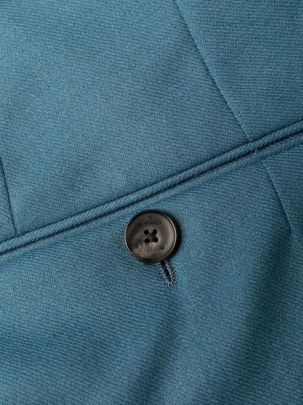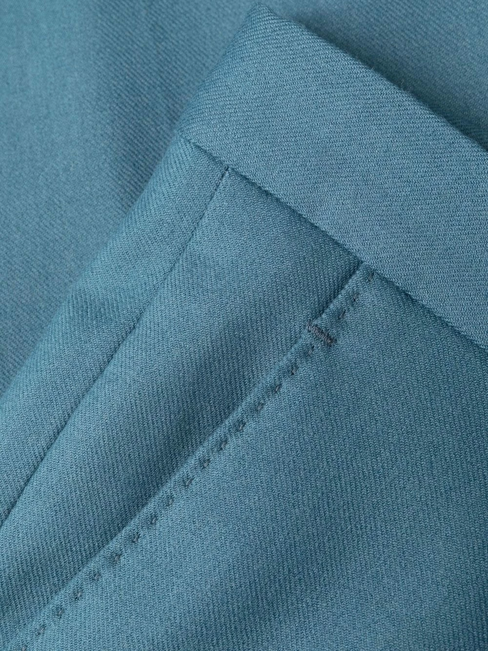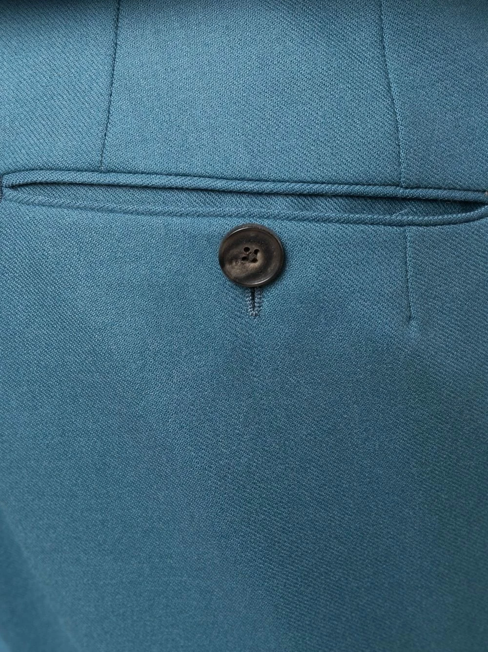 Passants de ceinture, fermeture dissimulée sur le devant, deux poches latérales fendues, poches arrière passepoilées, coupe fuselée.