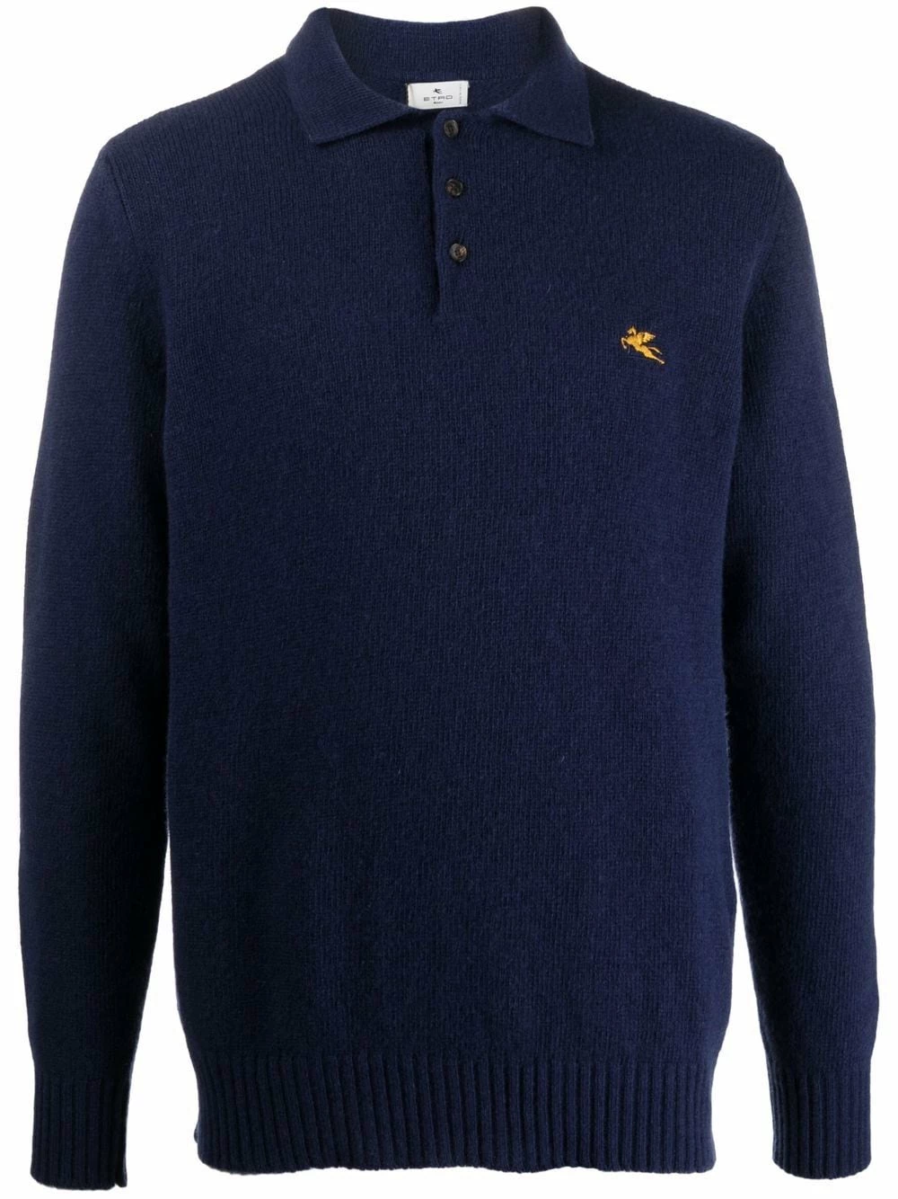 Motif brodé, col classique, patte de boutonnage sur le devant, manches longues, ourlet droit, détail nervuré. Couleur : bleu. Matière : laine.