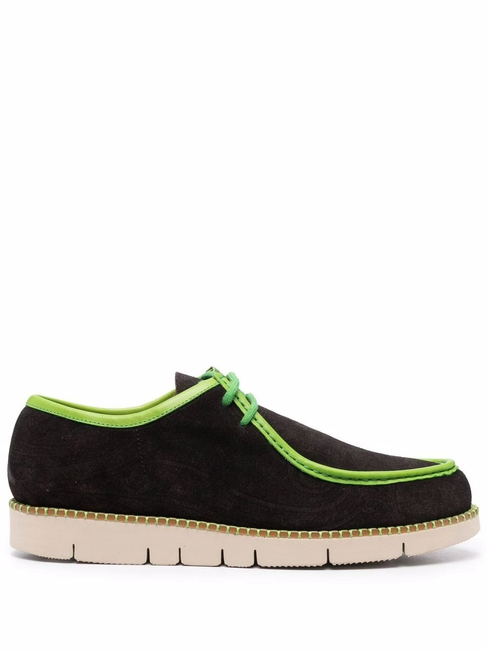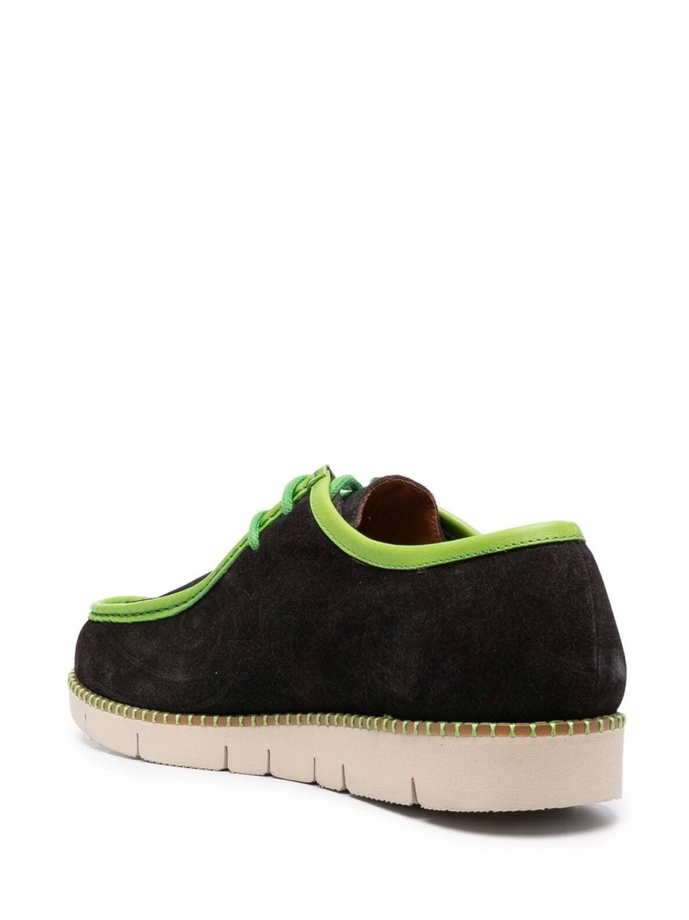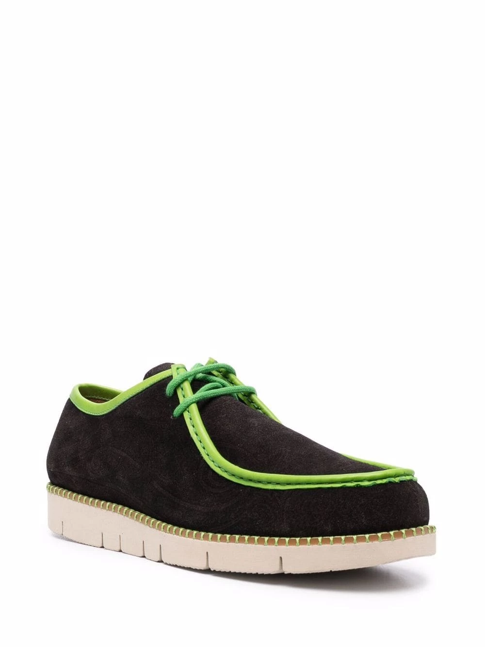 Finitions passepoilées, bout rond, fermeture à lacer sur le devant, semelle intérieure à logo, semelle plate.