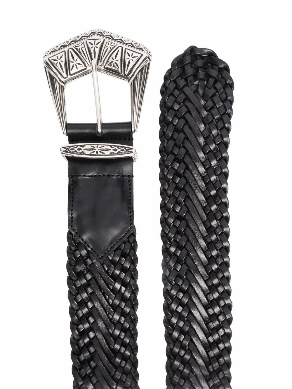 Taille ajustable, modèle d’inspiration Western, design tissé, fermeture à boucle argentée. Couleur : noir. Matière : cuir.