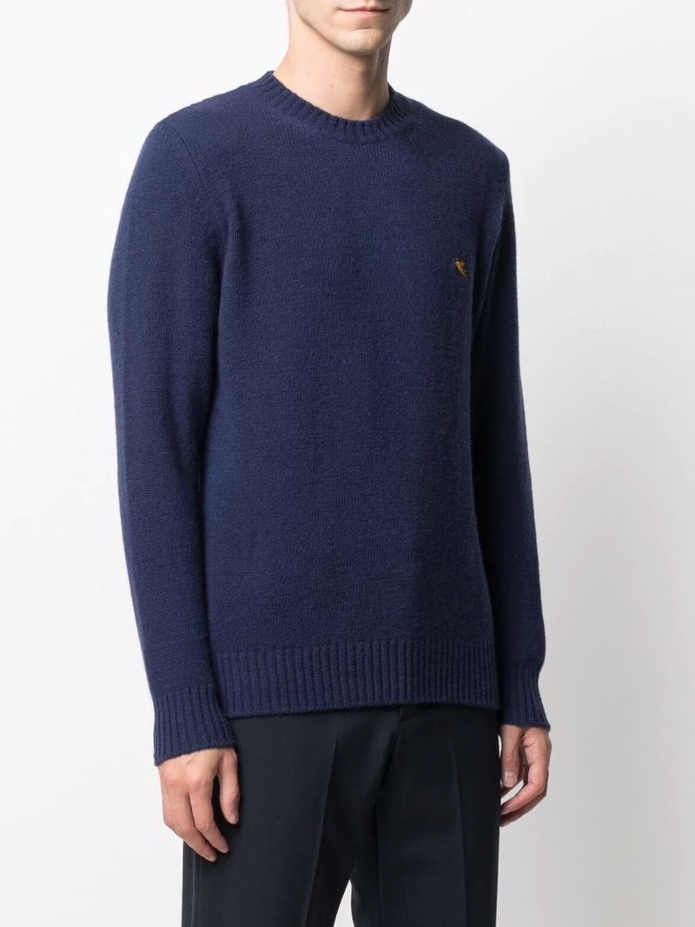 Design tricoté, manches longues, logo brodé sur la poitrine, encolure ras du cou. Couleur : bleu. Matière : laine.