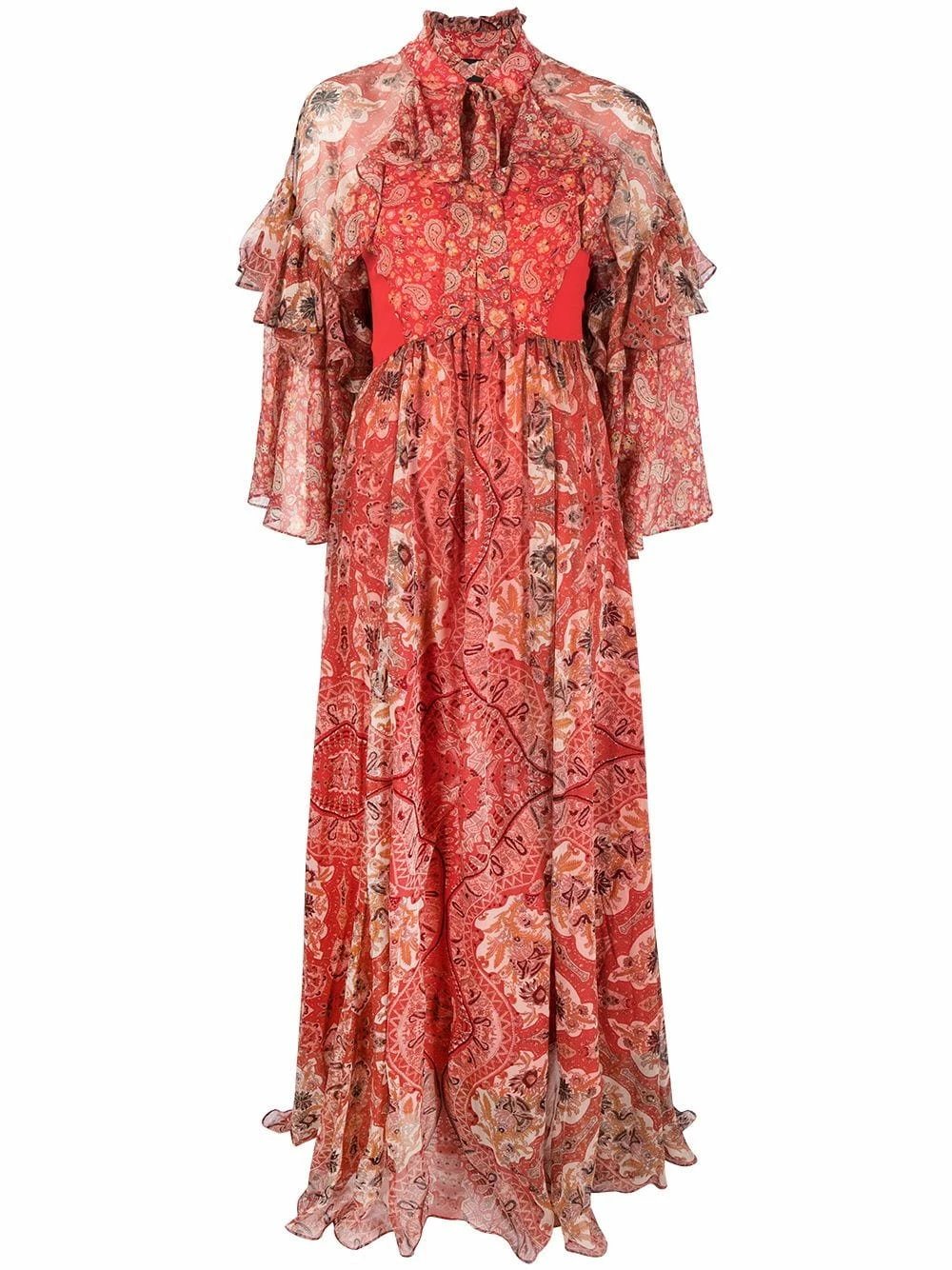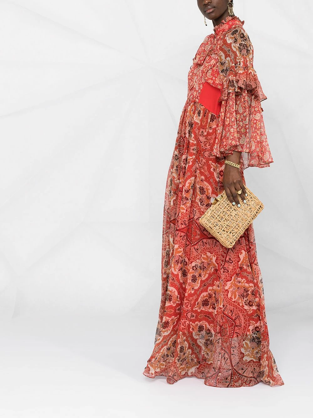 Motif cachemire, design de volants superposés, détails de volants, manches longues. Couleur : Rouge. Matière : soie.