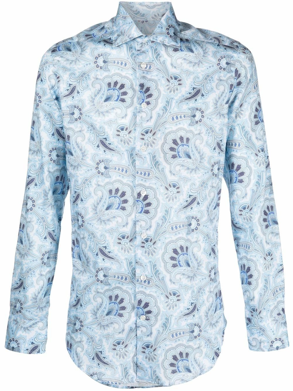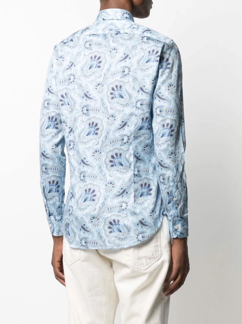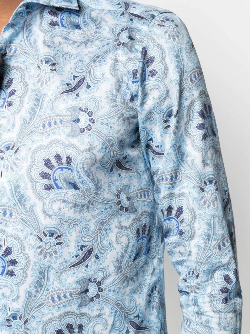 Motif cachemire, col boutonné, manches longues, manches à poignets resserrés. Couleur : bleu. Matière : coton.