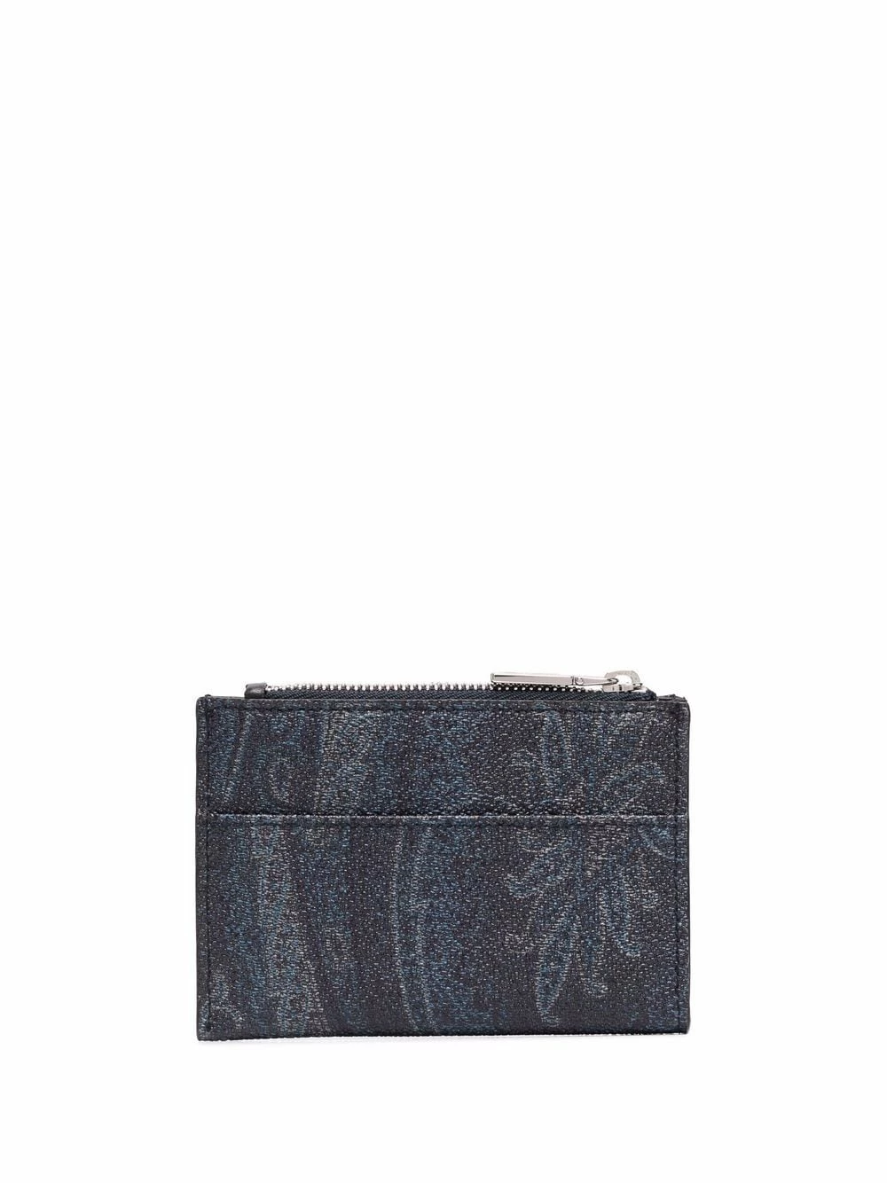 Doublure en cuir, motif cachemire, plaque logo argentée, fermeture zippée sur le dessus, compartiments intérieurs pour carte, poche ticket. Couleur : bleu. Matière : cuir.