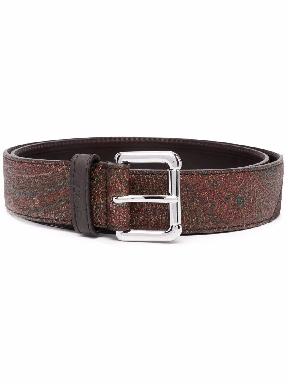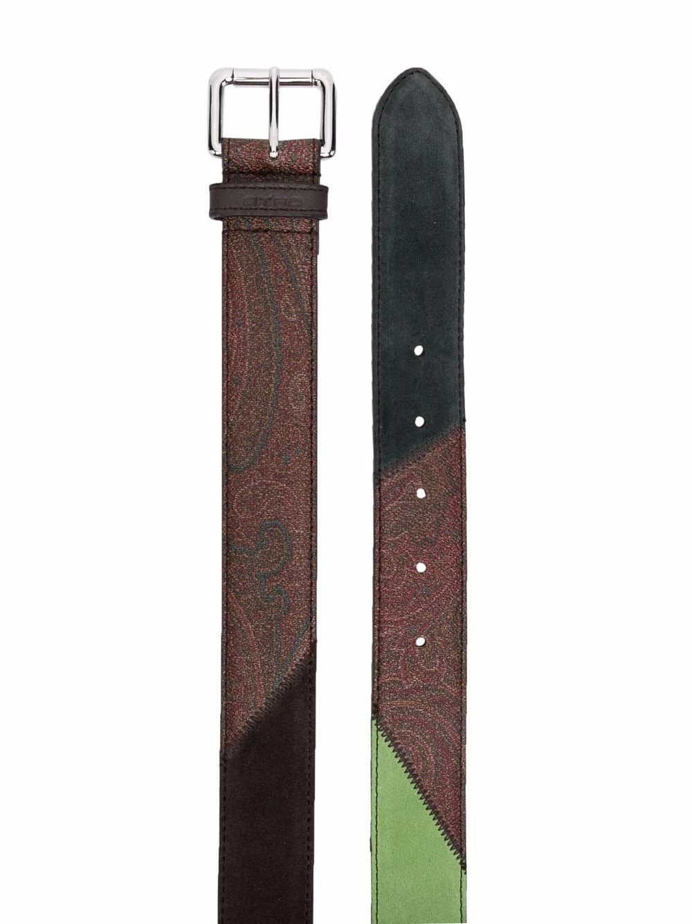 Motif cachemire, empiècements contrastants, détails de perforation, fermeture à boucle.