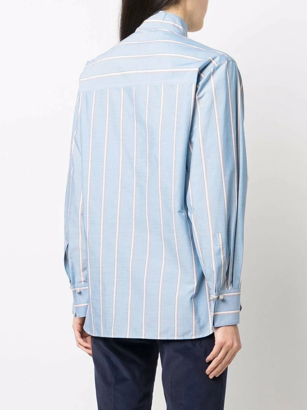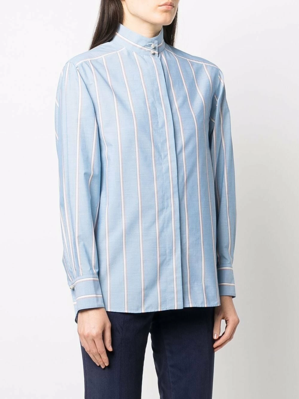Col montant, boutonnière sur le devant, manches longues, poignets boutonnés, ourlet incurvé. Matière : coton.