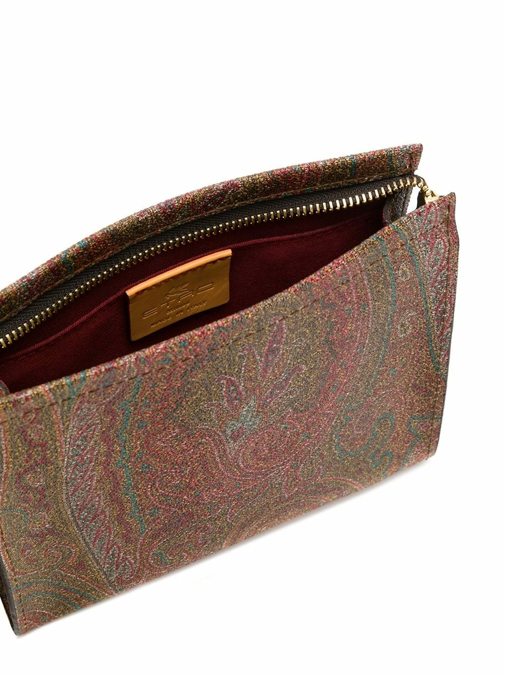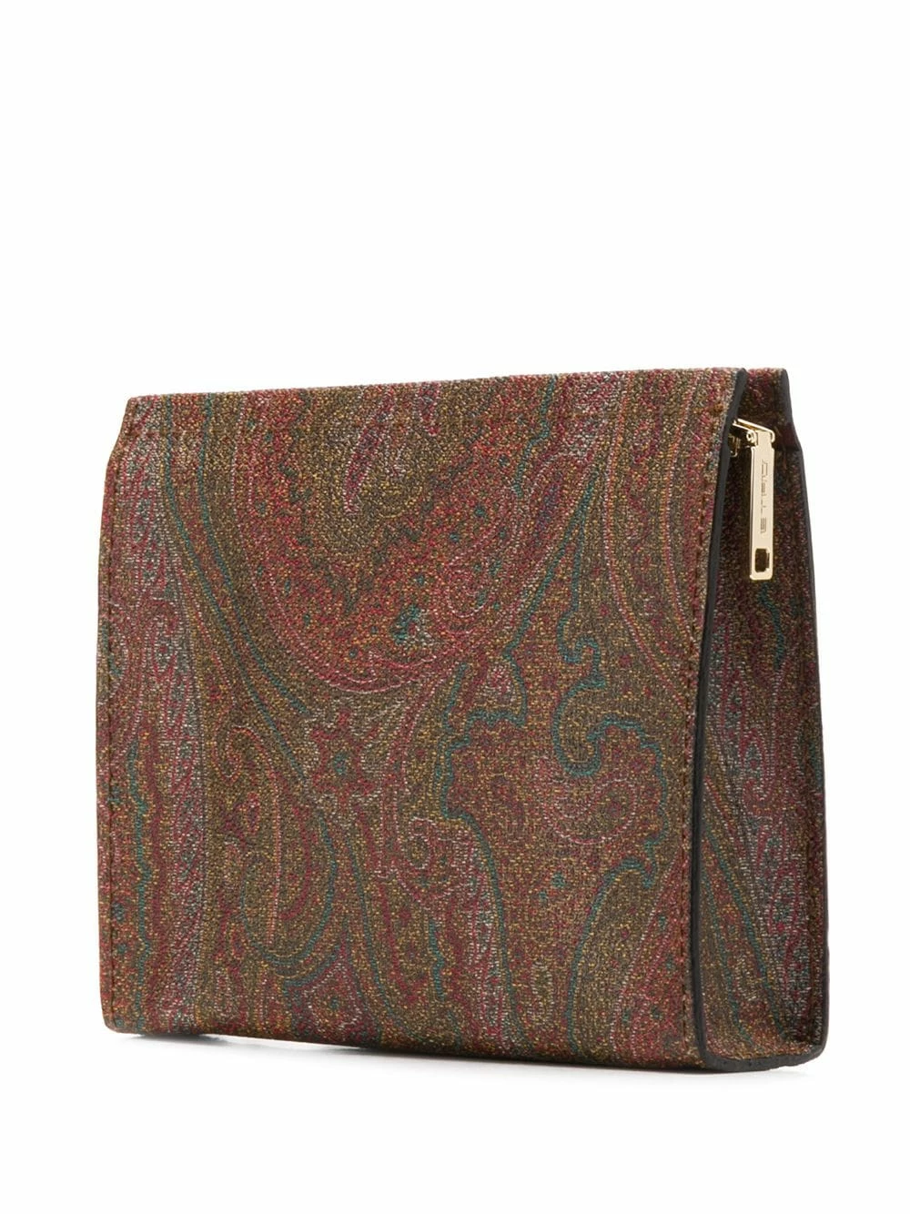Pochette à motif cachemire Etro avec forme rectangulaire, fermeture zippée sur le dessus, compartiment intérieur, poche intérieure plaquée, patch logo intérieur et bride portée poignet.
