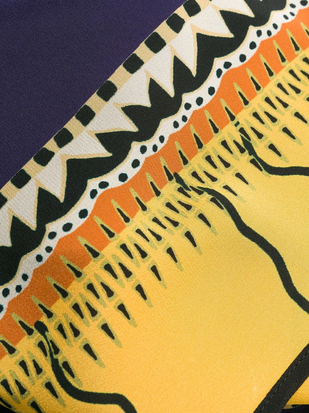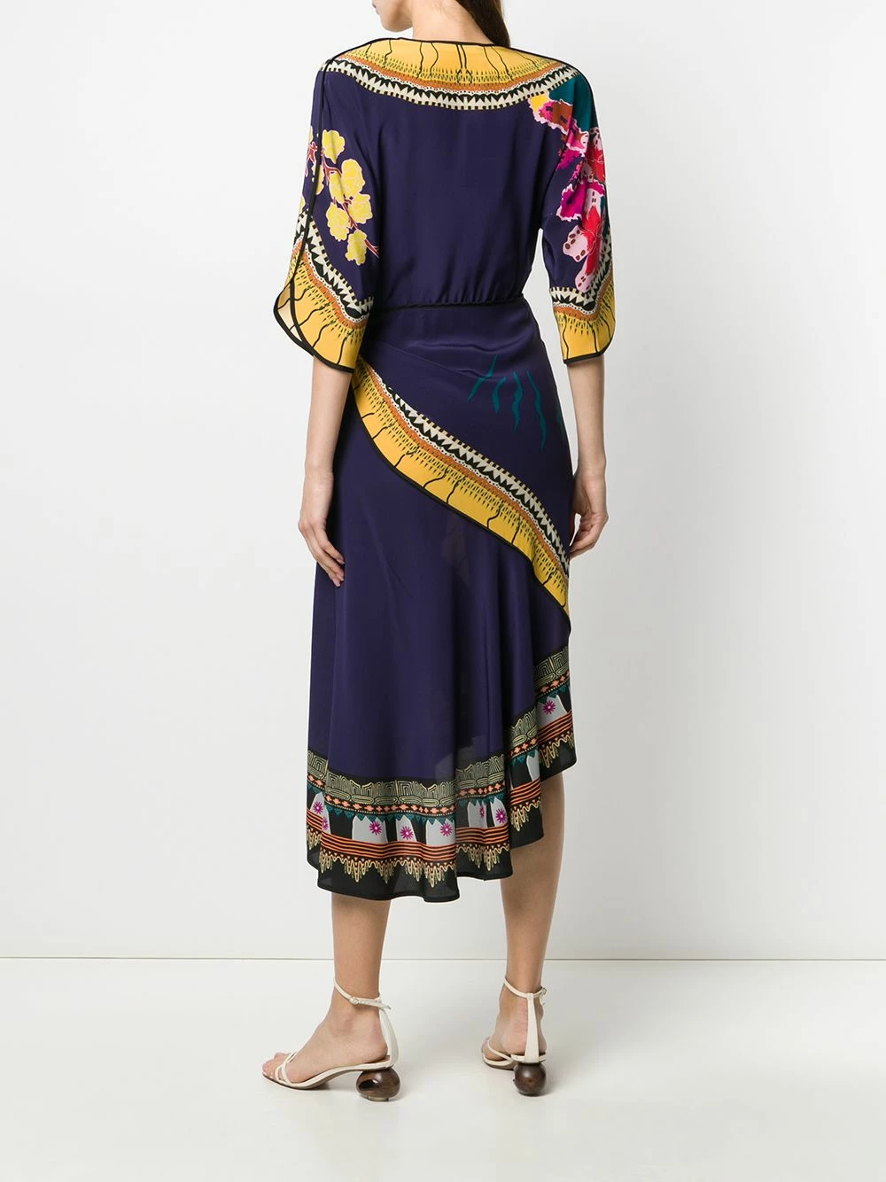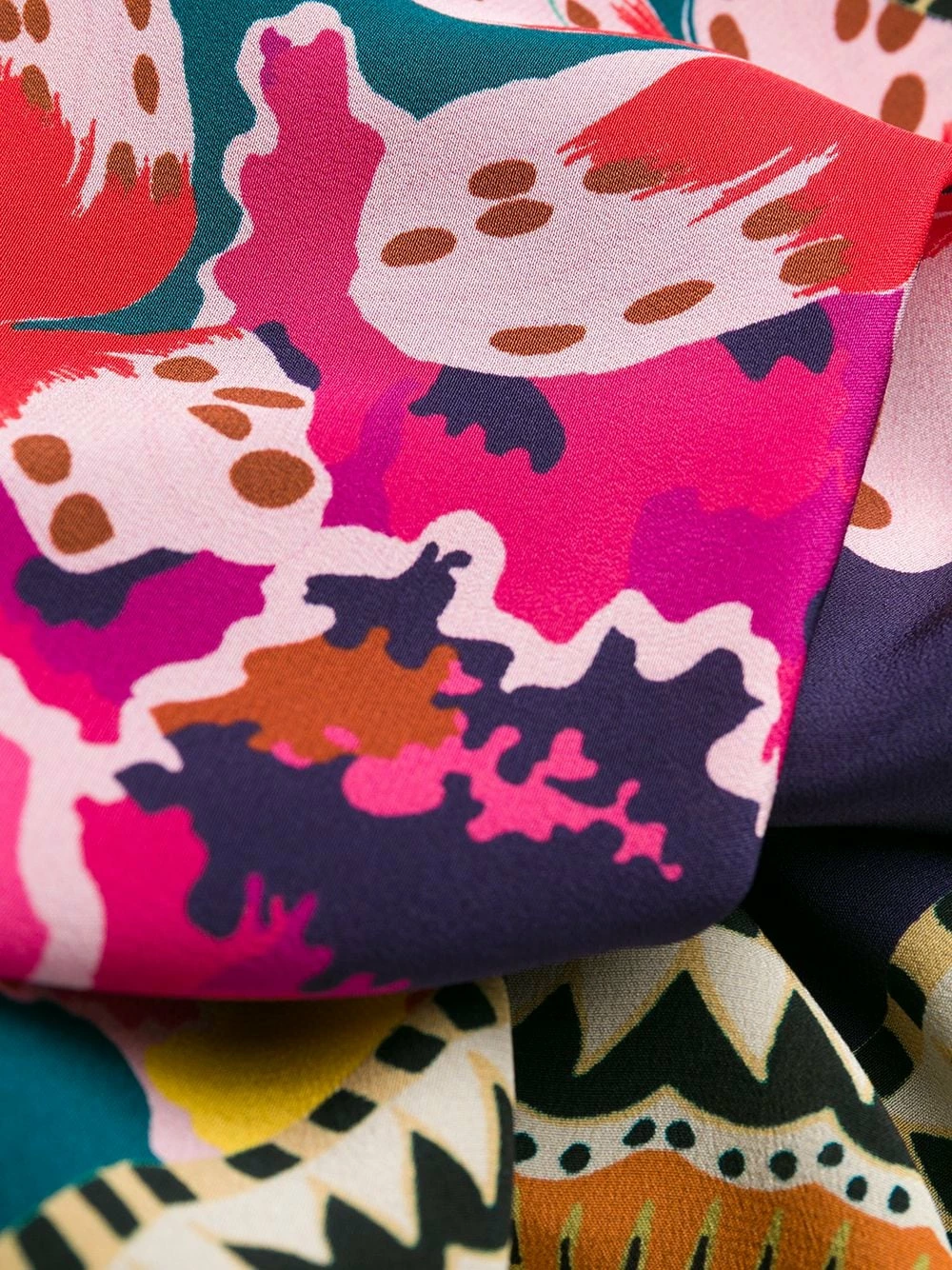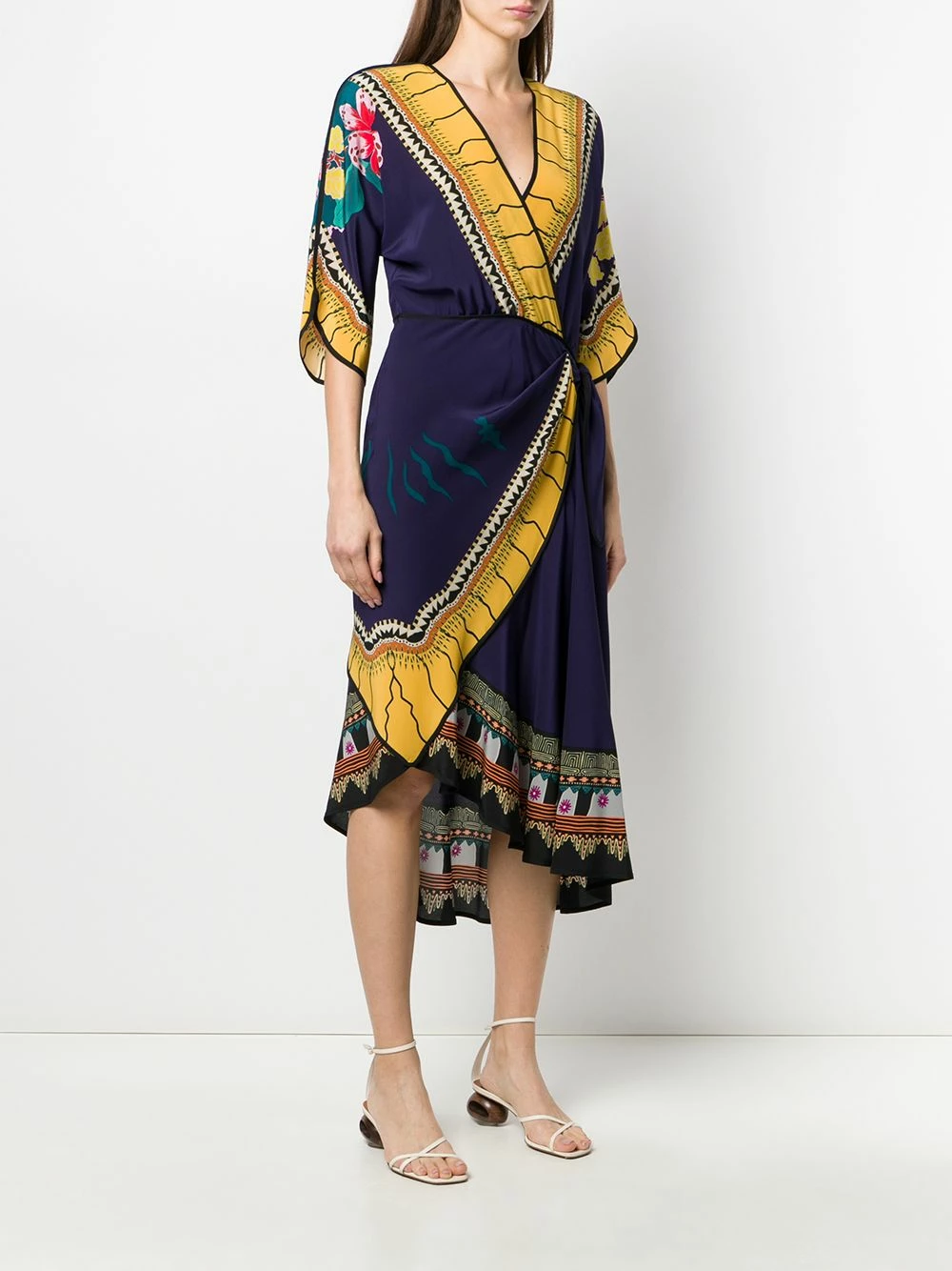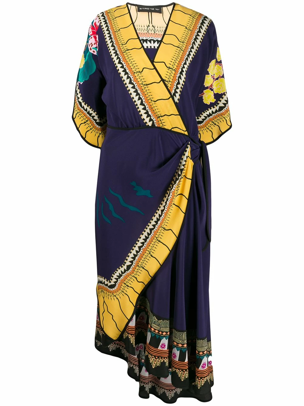 Robe mi-longue imprimée à design portefeuille en soie Etro avec imprimé abstrait, devant à effet portefeuille, col v, manches trois quarts, longueur medium et fermeture à nouer.