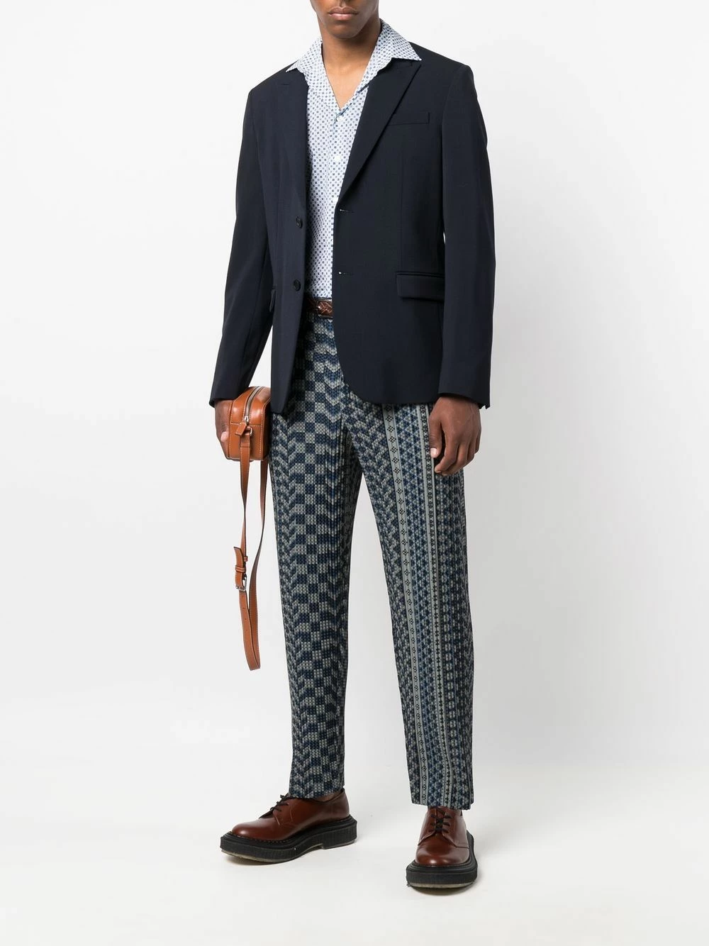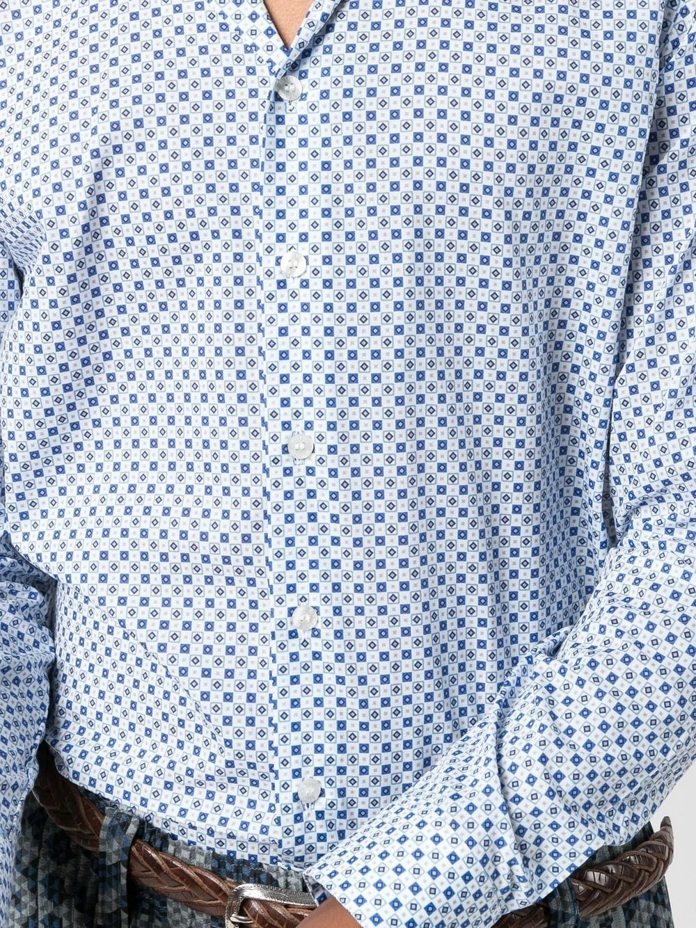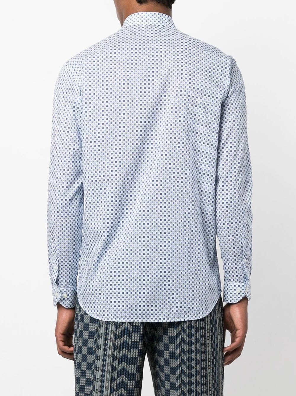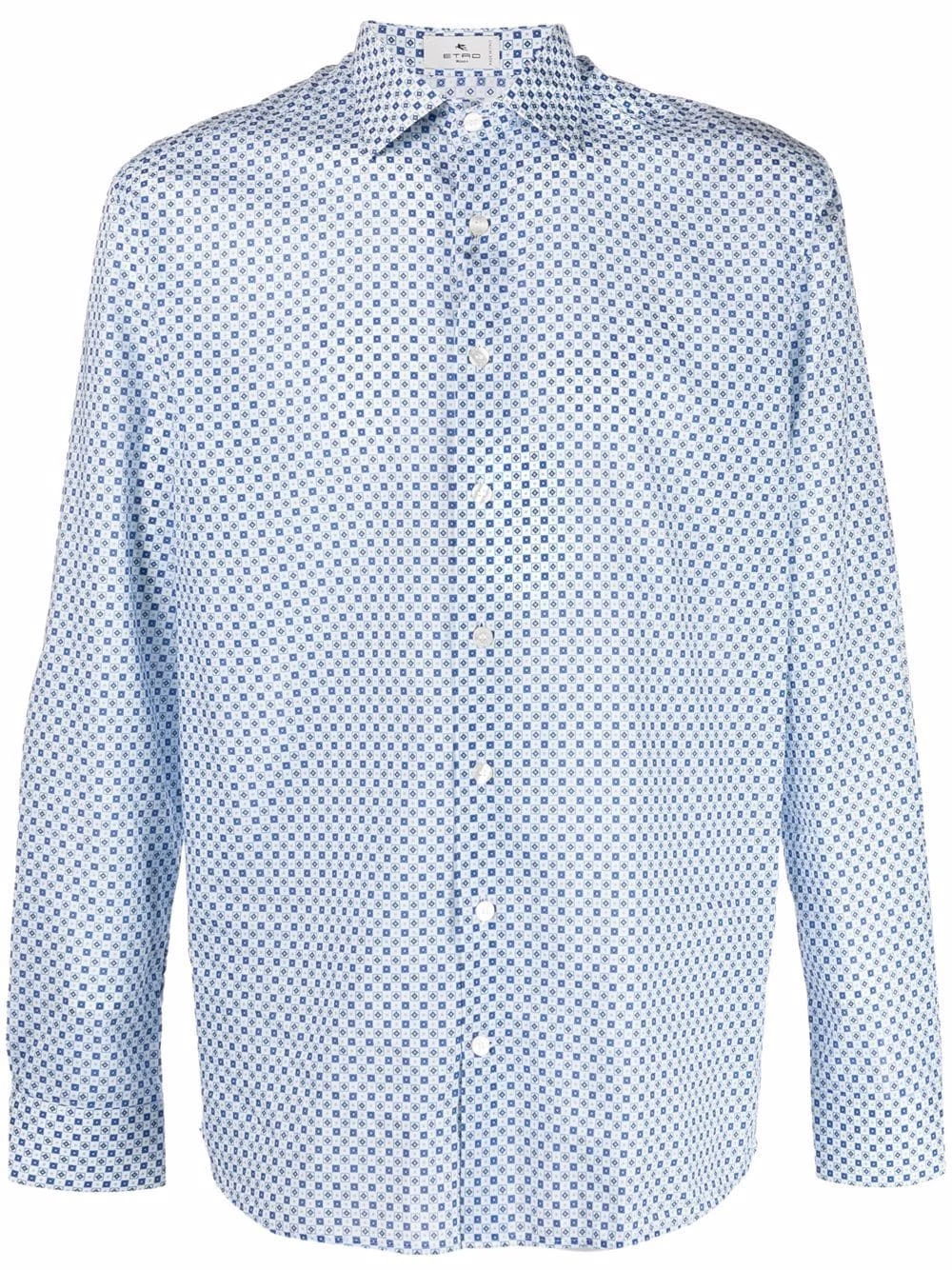 Imprimé graphique, col classique, boutonnière sur le devant, manches longues, poignets boutonnés, ourlet incurvé au dos. Couleur : bleu. Matière : coton.