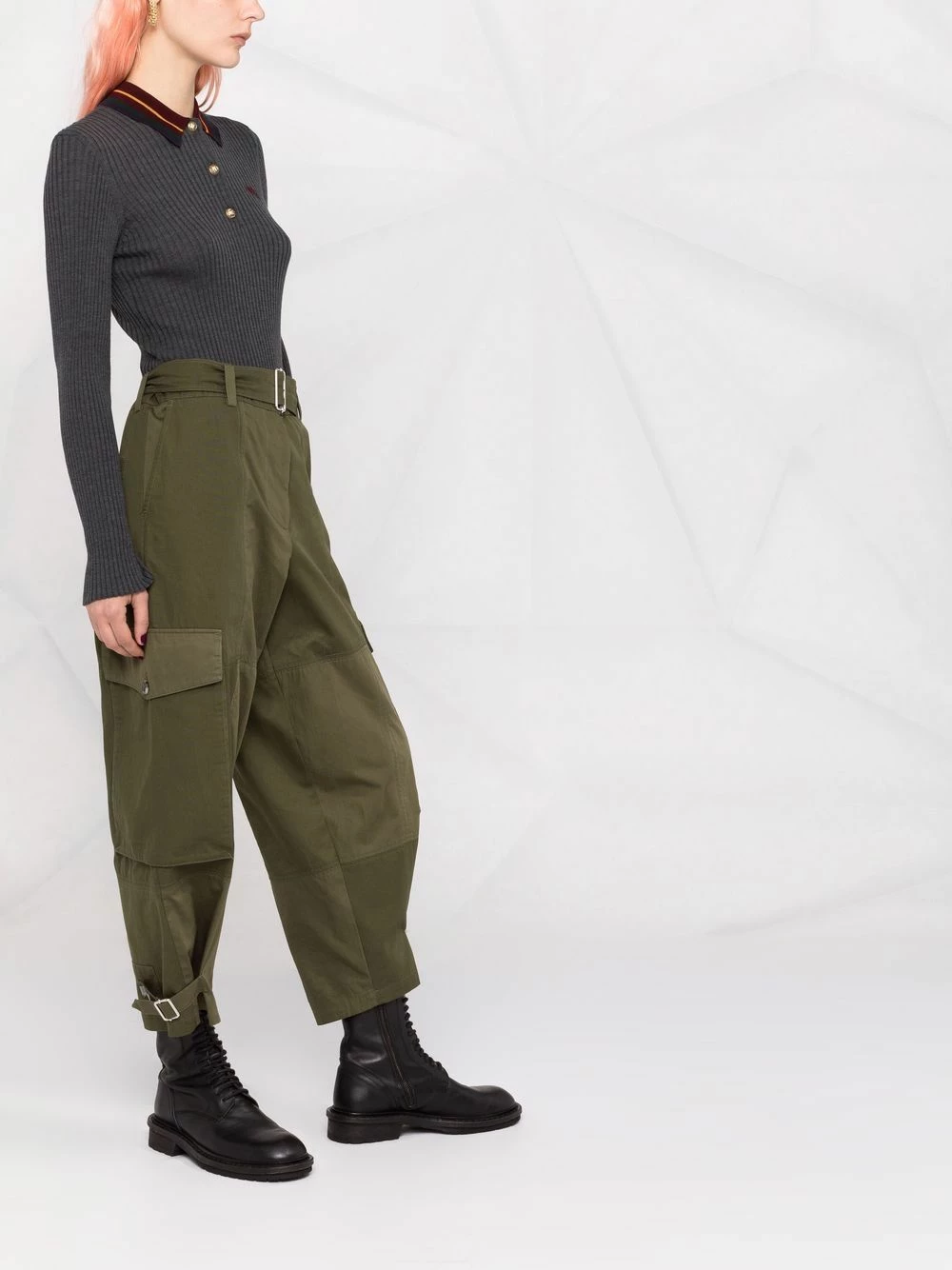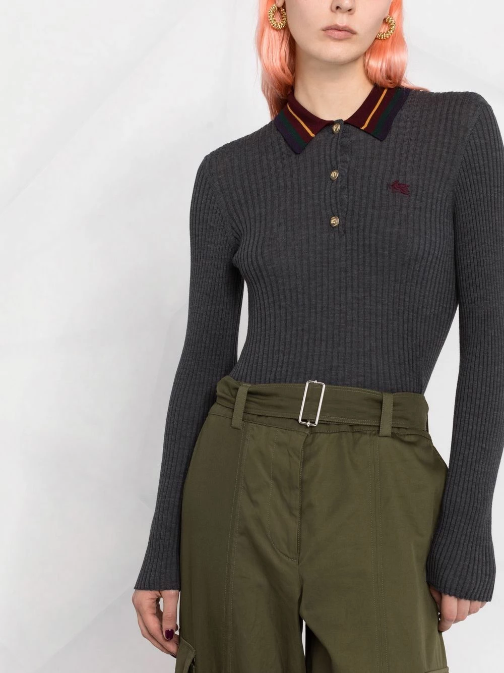 Maille nervurée, logo brodé sur la poitrine, bordure rayée, boutons dorés à détails embossés, col polo, boutonnière sur le devant, manches longues. Couleur : gris. Matière : laine.