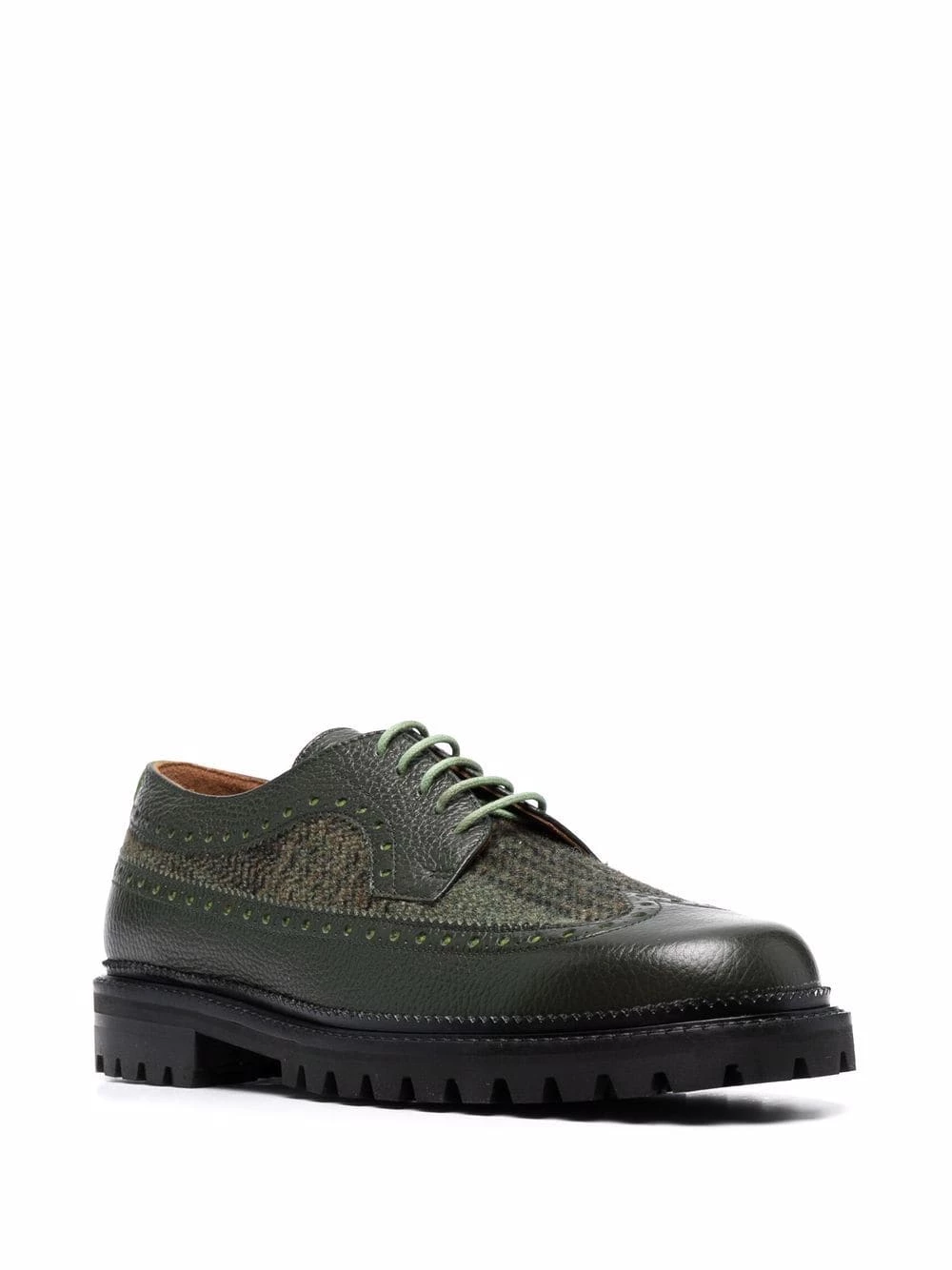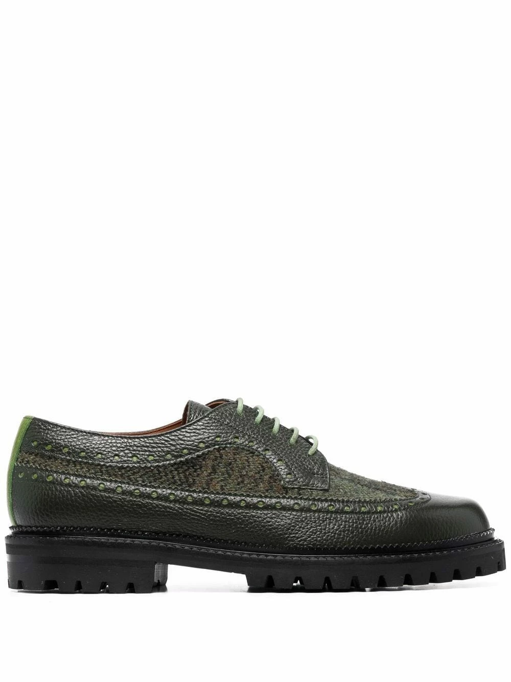 Design à empiècements, motif tartan, finitions façon richelieu, bout rond, fermeture à lacer sur le devant, semelle intérieure griffée, semelle plate en caoutchouc. Couleur : vert. Matière : cuir de veau.