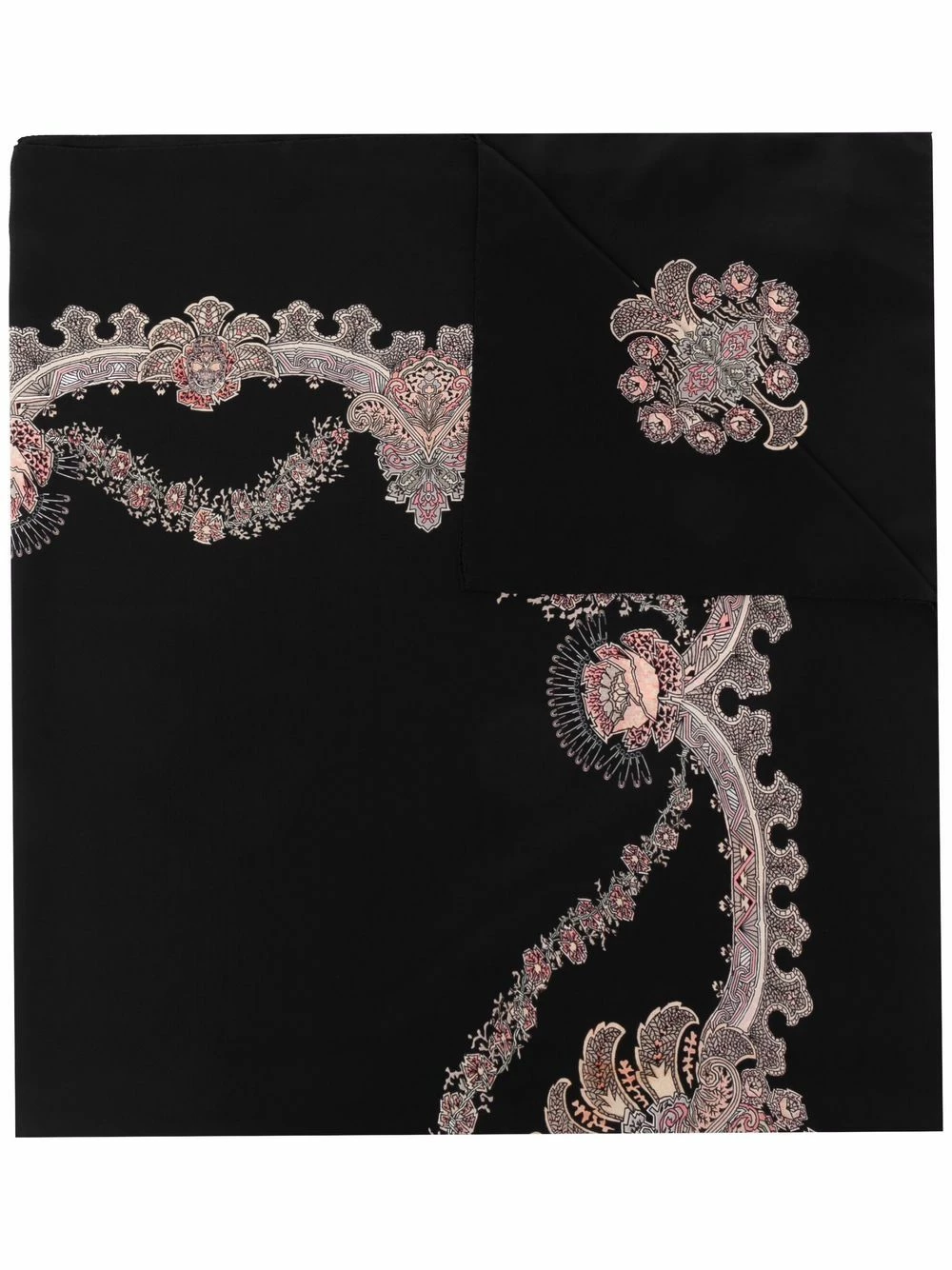 Motif de fleurs, bords finis, coupe longue, monture carrée. Matière : soie.