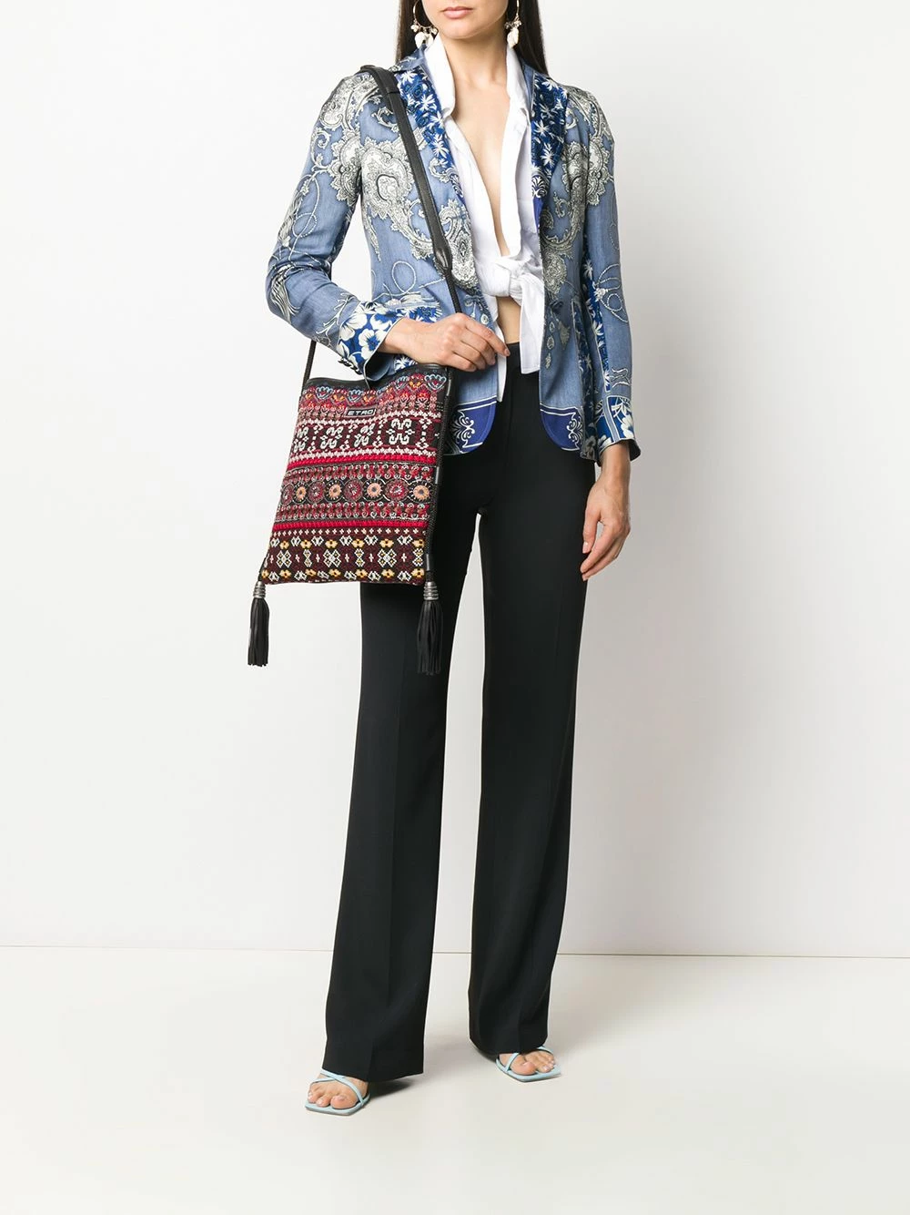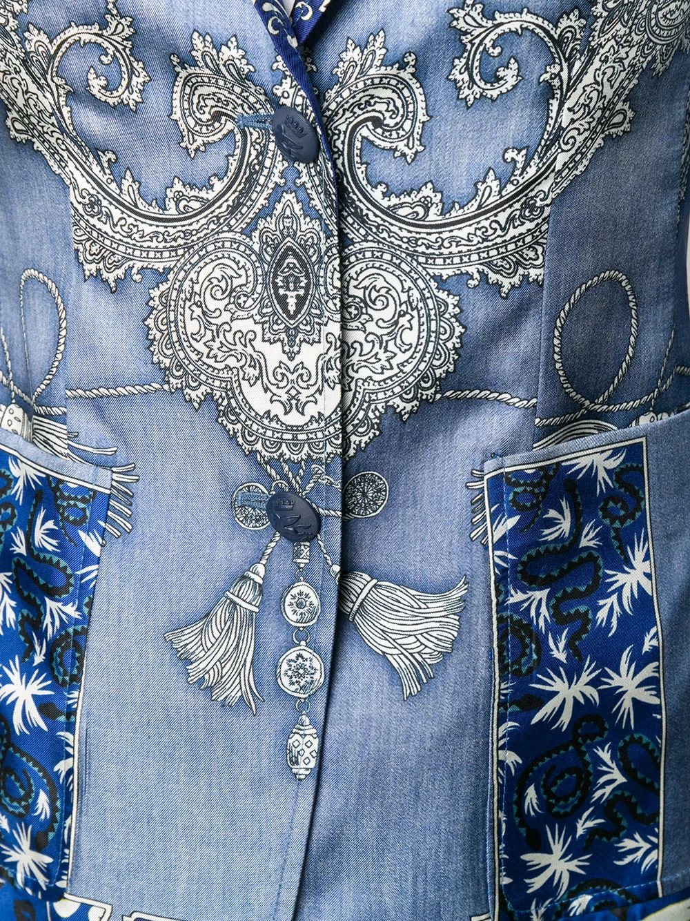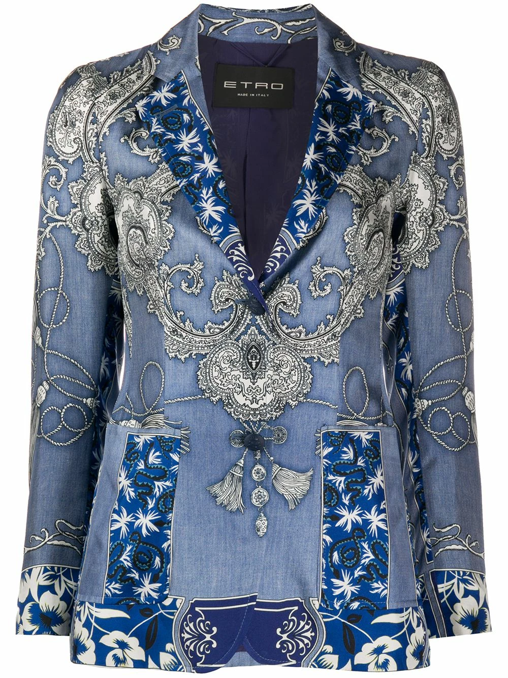 Coupe ajustée, imprimé bandana, poignets boutonnés, ourlet droit, revers crantés, boutonnière sur le devant, manches longues, deux poches latérales plaquées. Couleur : bleu. Matière : soie.