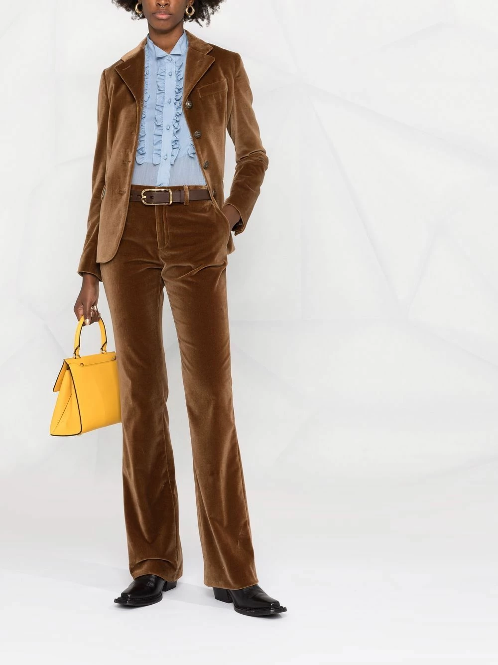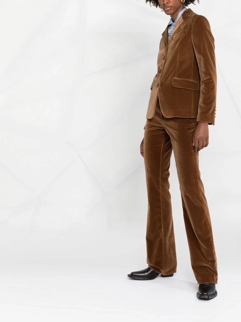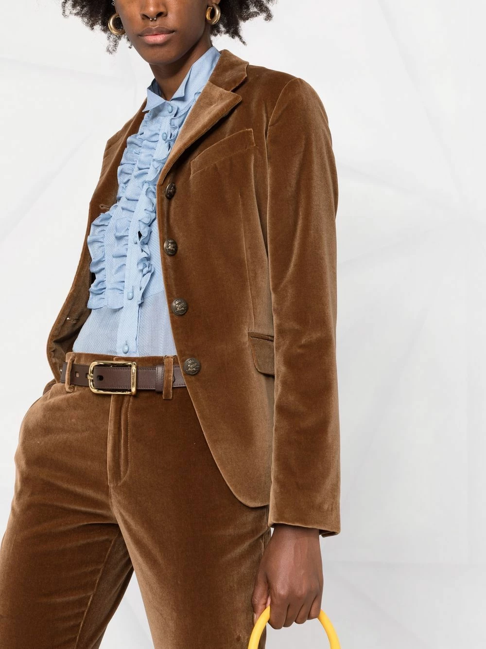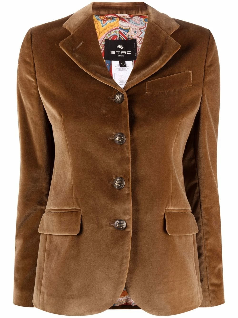 Revers classiques, boutonnière sur le devant, manches longues, poche passepoilée sur la poitrine, deux poches à rabat sur le devant. Couleur : marron. Matière : coton.