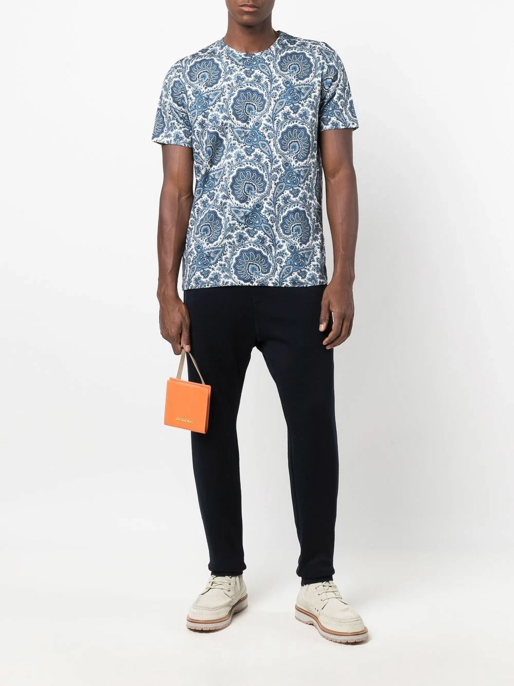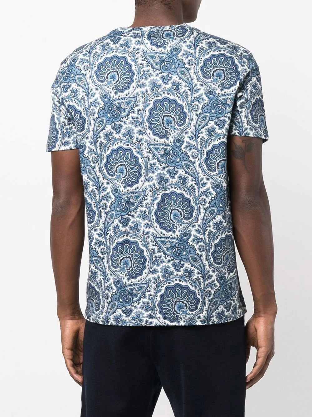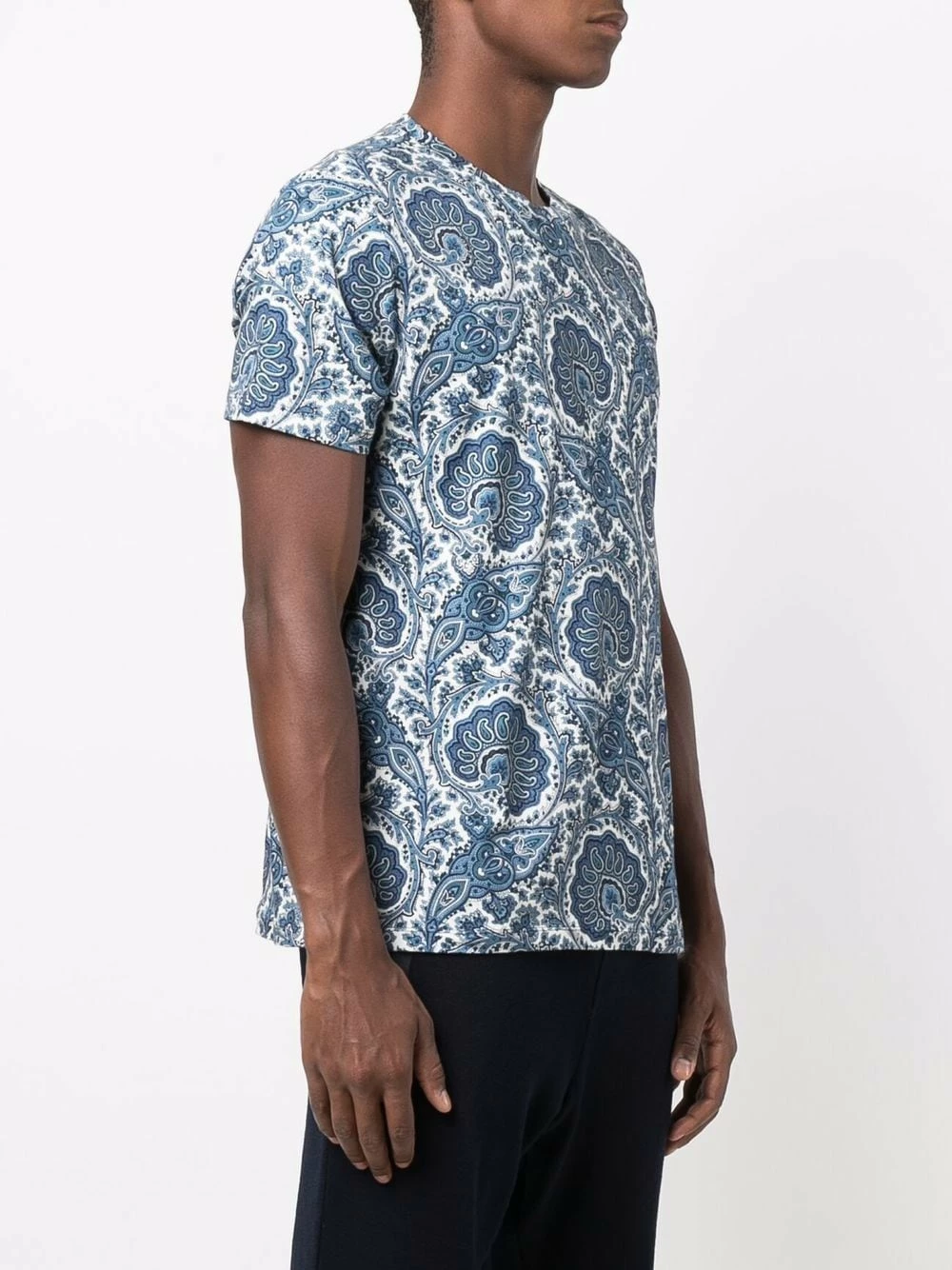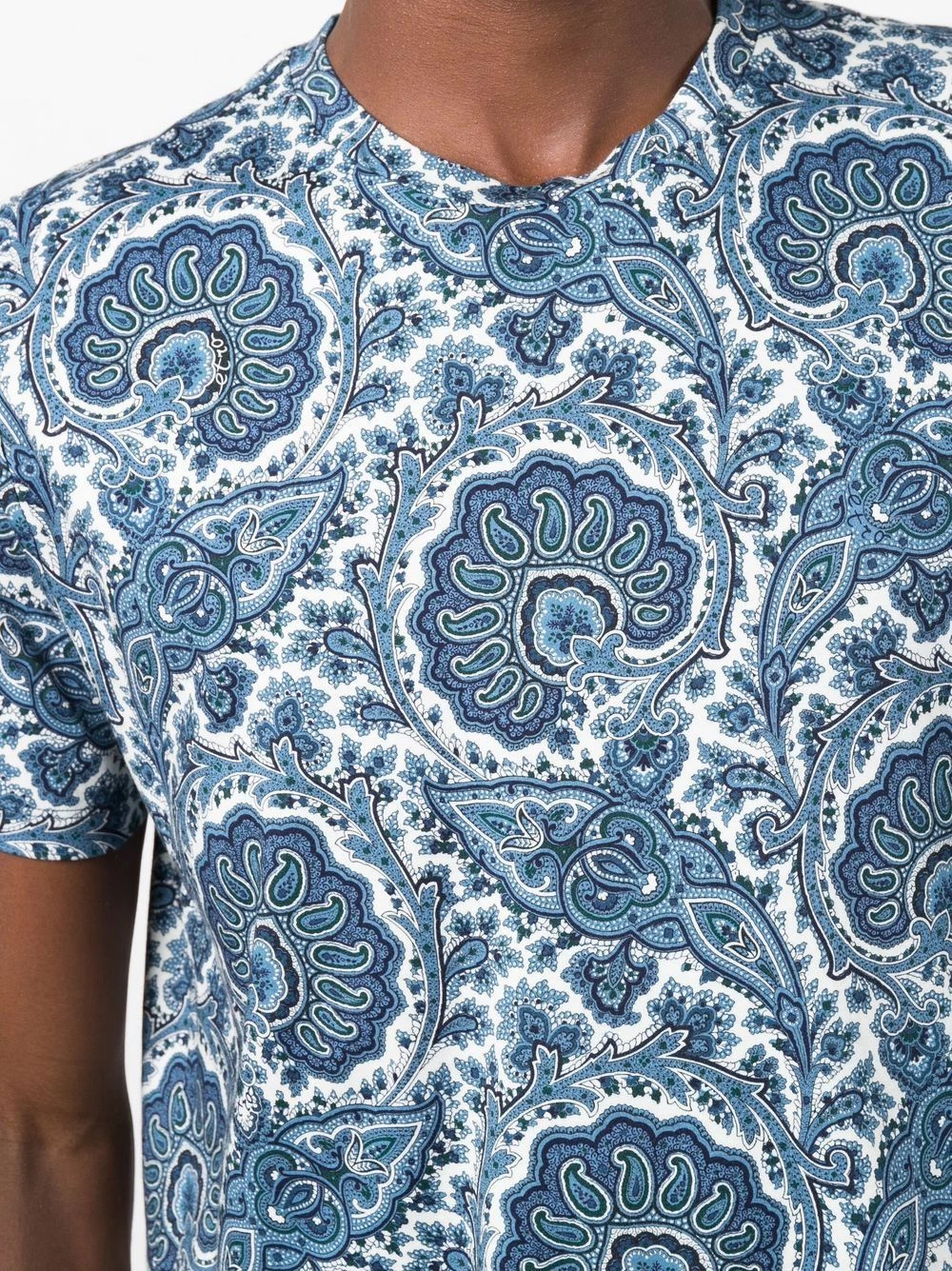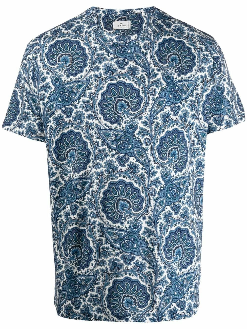 Motif cachemire, encolure ronde, manches courtes, ourlet droit. Matière : coton.