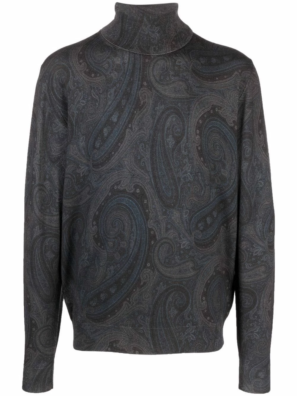 Maille fine, motif cachemire, col roulé, manches longues. Matière : laine vierge.