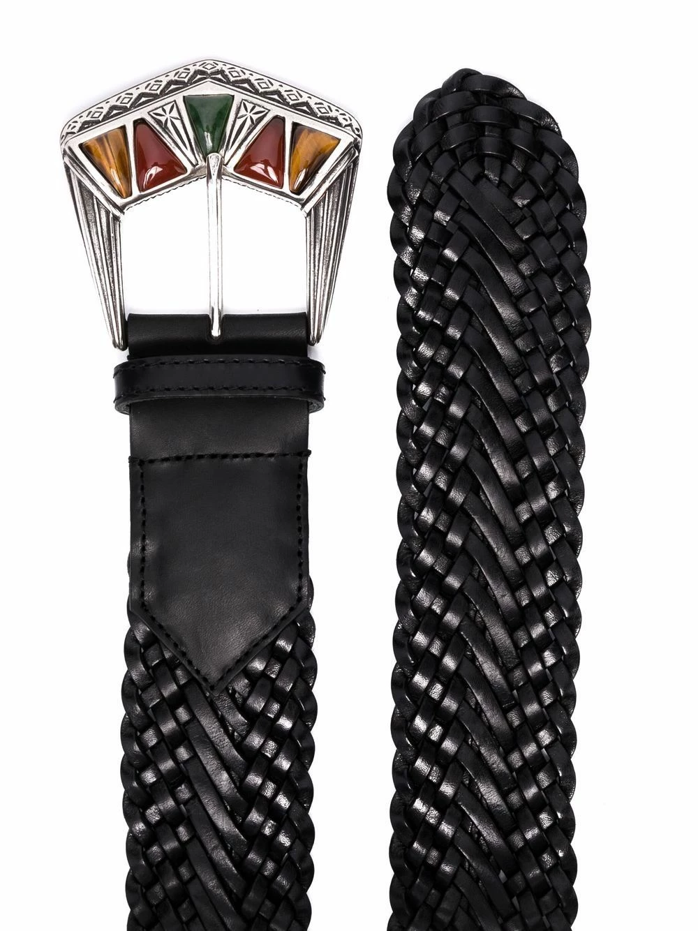 Taille ajustable, ornements argentés, lanière tressée. Matière : cuir de veau.