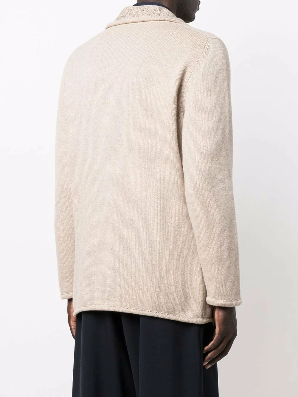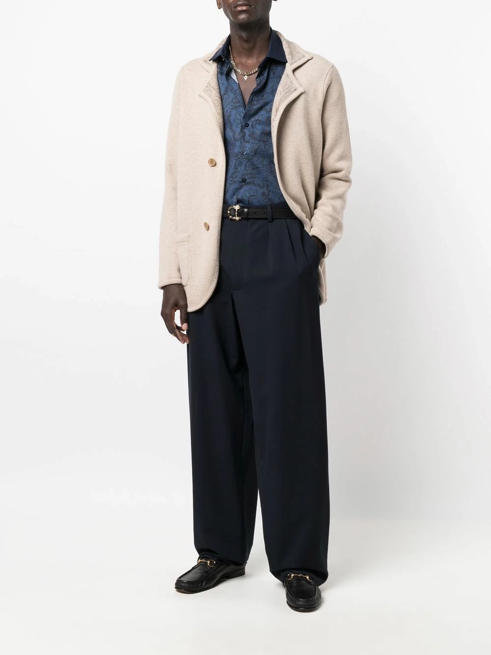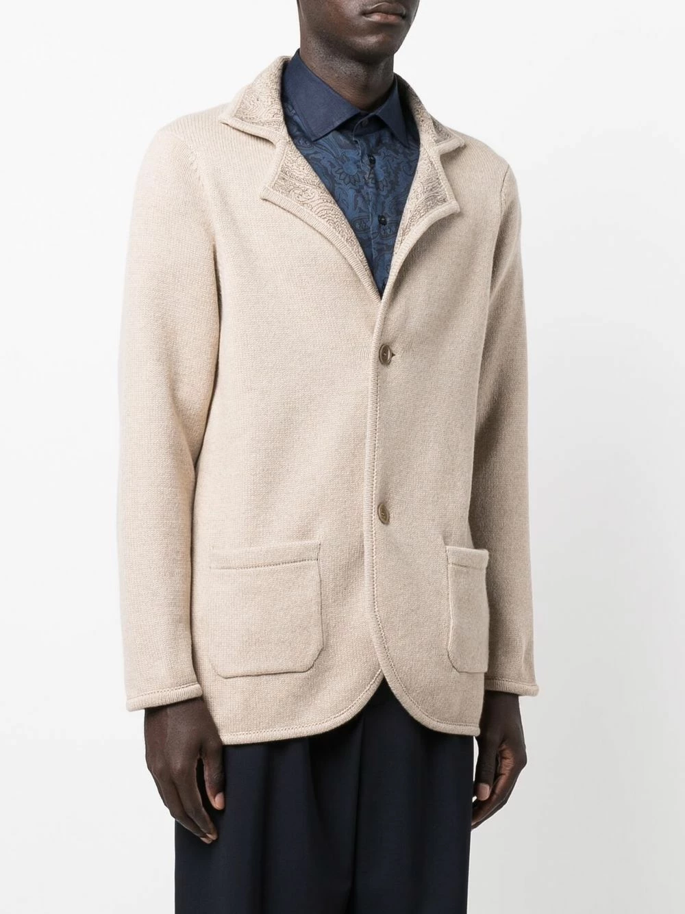 Revers crantés, boutonnière sur le devant, manches longues, deux poches plaquées.