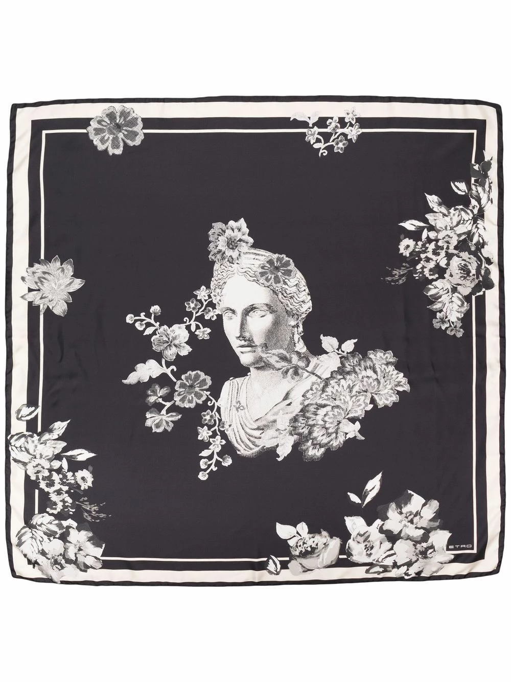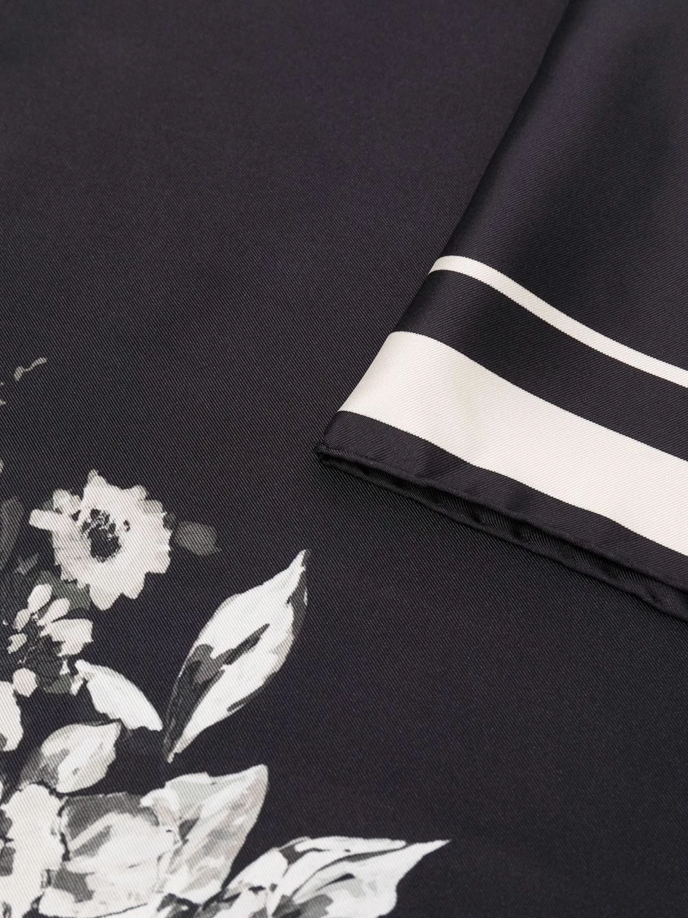 Forme carrée, bords contrastants, imprimé à fleurs à l’avant, bords finis. Matière : soie.