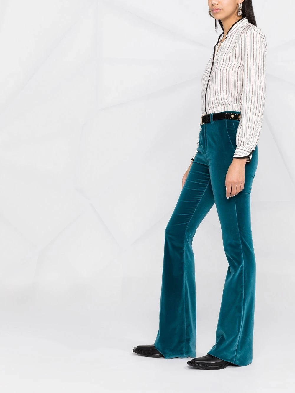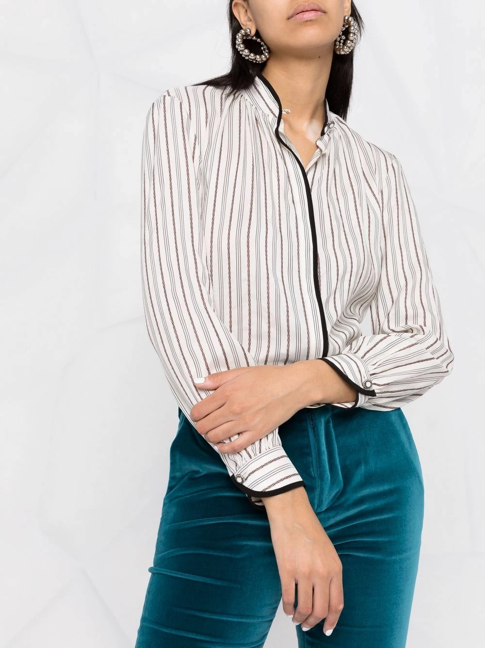 Rayures verticales, bordure contrastante, col montant, fermeture dissimulée sur le devant, manches longues, manches à poignets boutonnés, ourlet incurvé. Matière : soie.