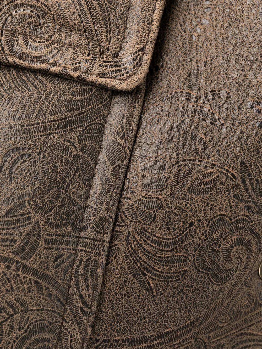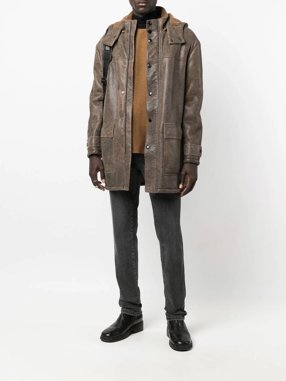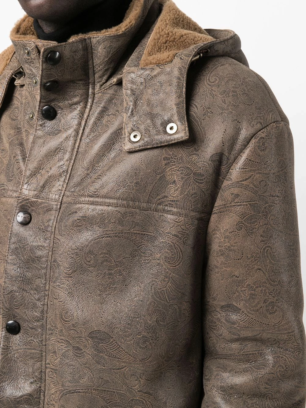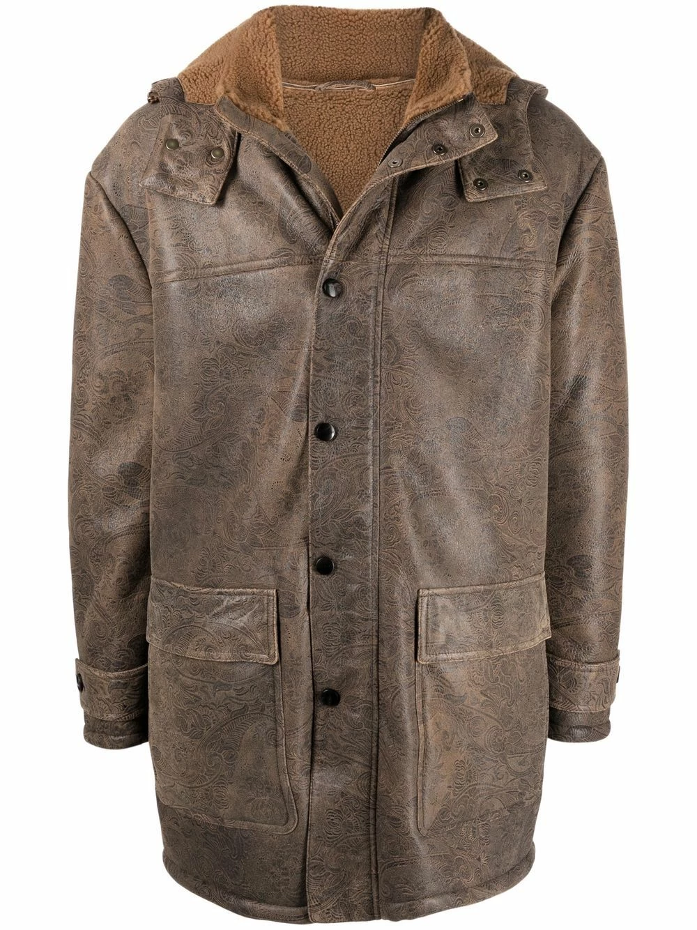 Motif cachemire, doublure à fourrure, capuche classique, boutonnière sur le devant, poches devant à rabat, manches longues, poignets boutonnés. Couleur : marron.