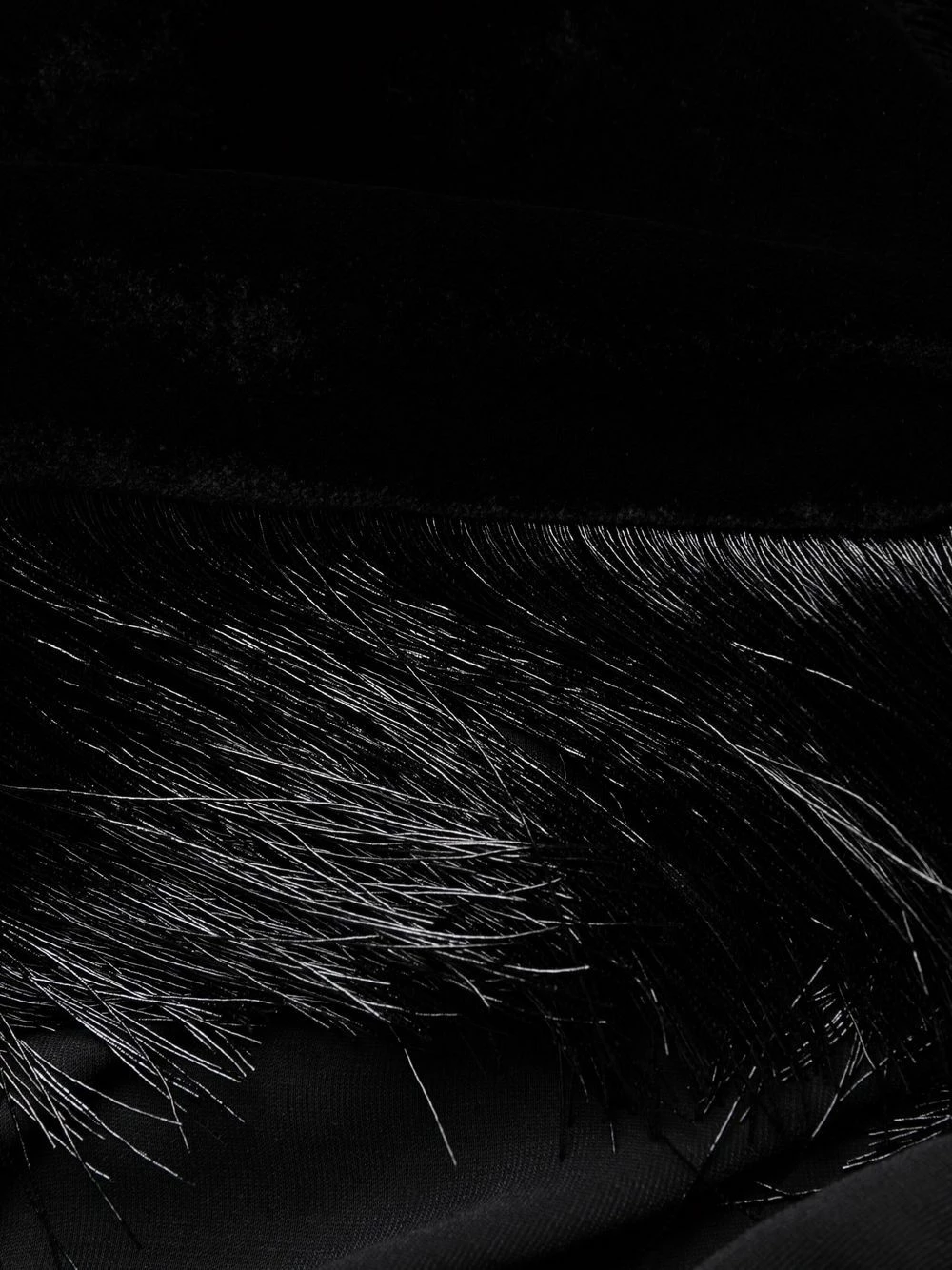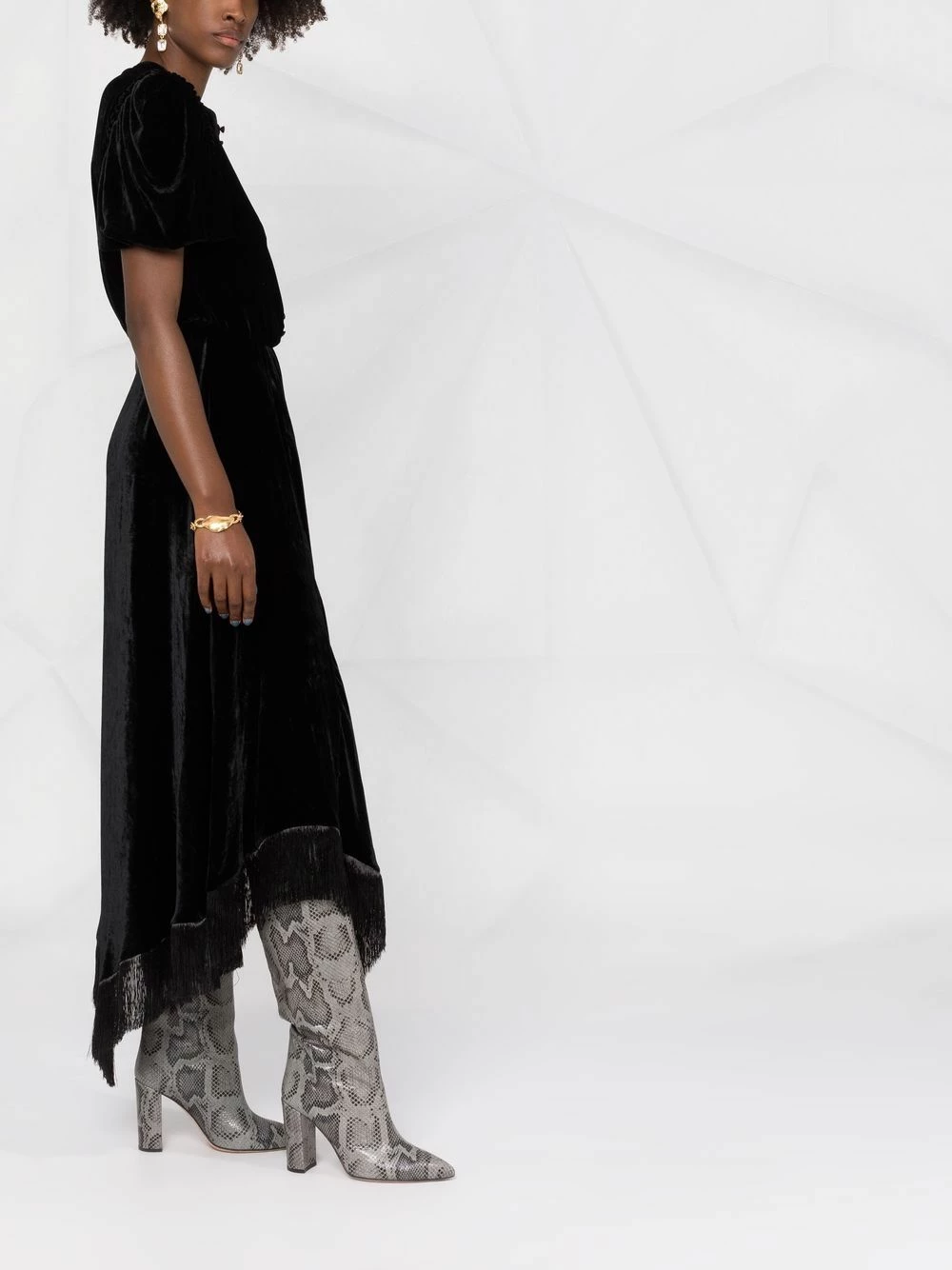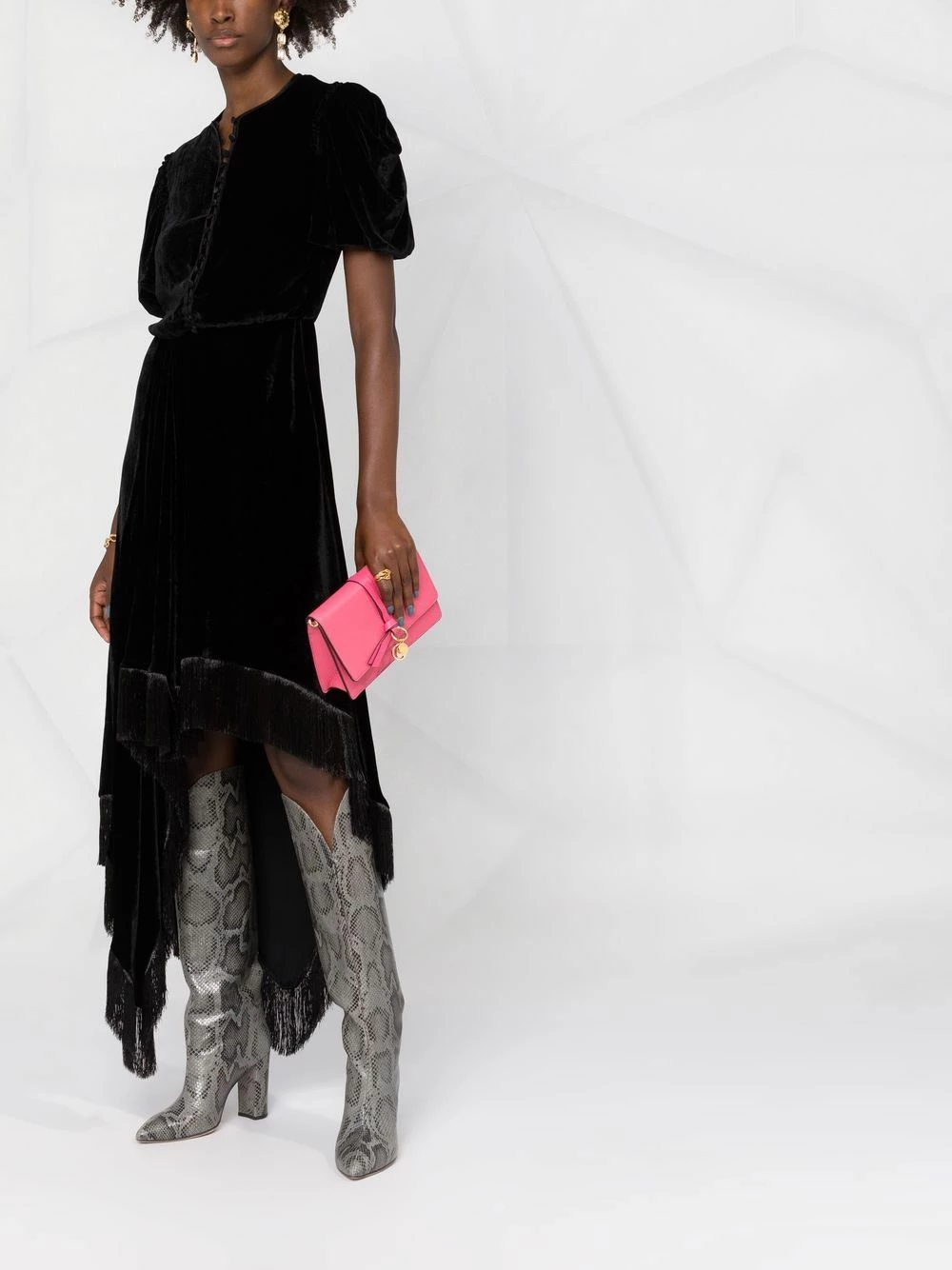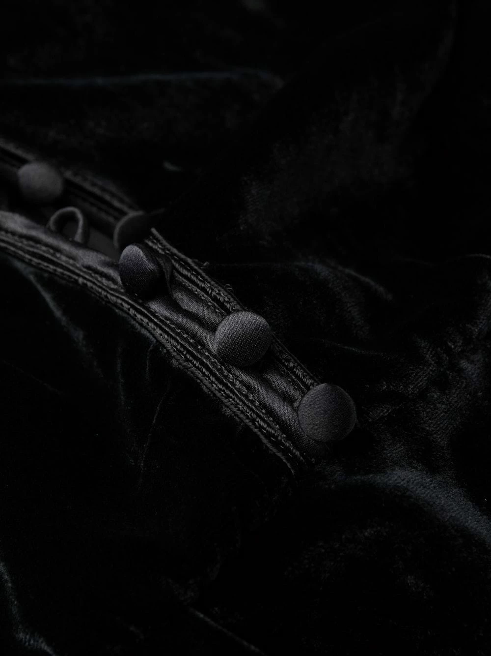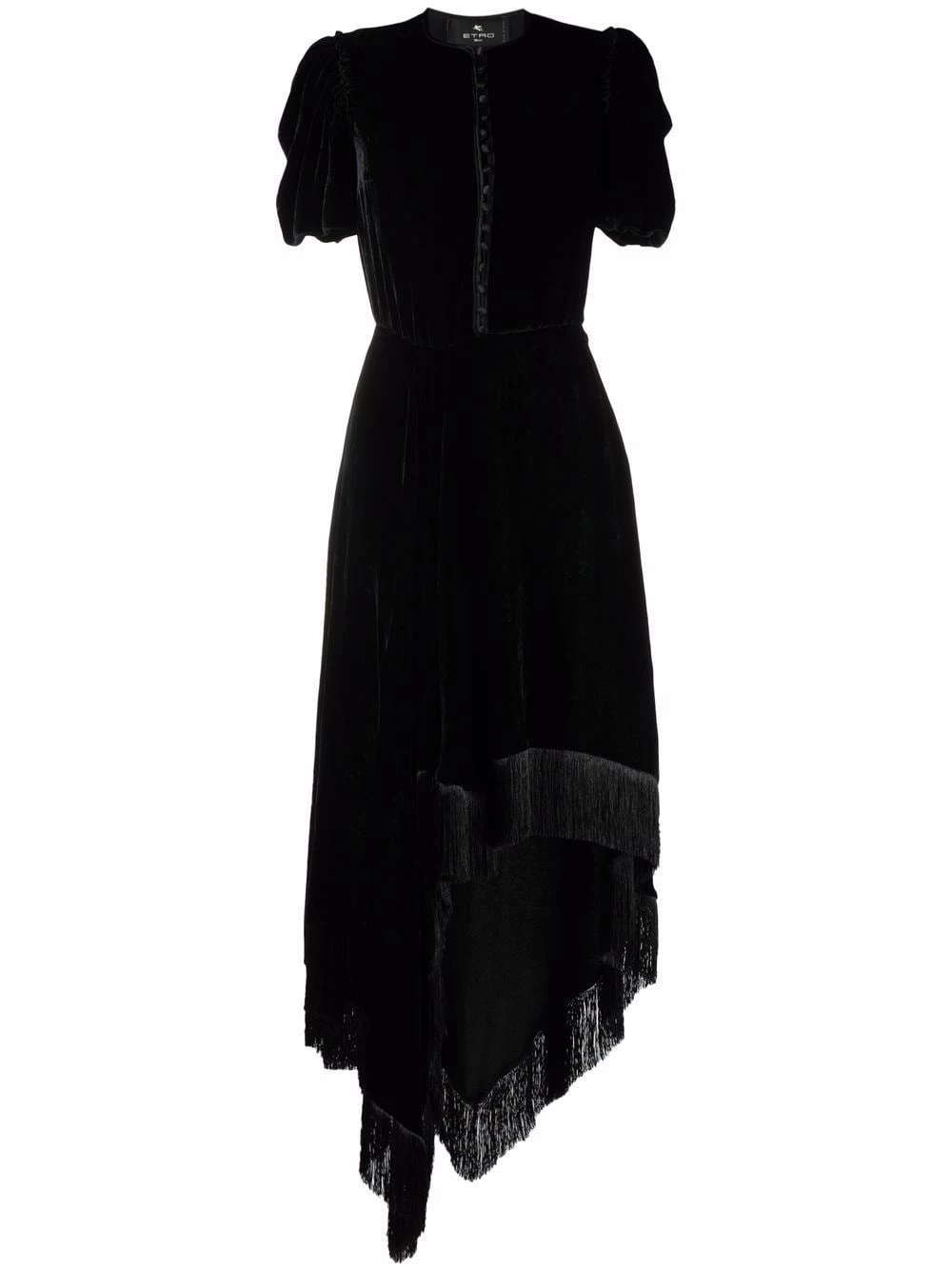Encolure ronde, patte de boutonnage sur le devant, manches bouffantes courtes, taille ajustée, design asymétrique, bordure à franges, coupe longue. Couleur : noir. Matière : soie.