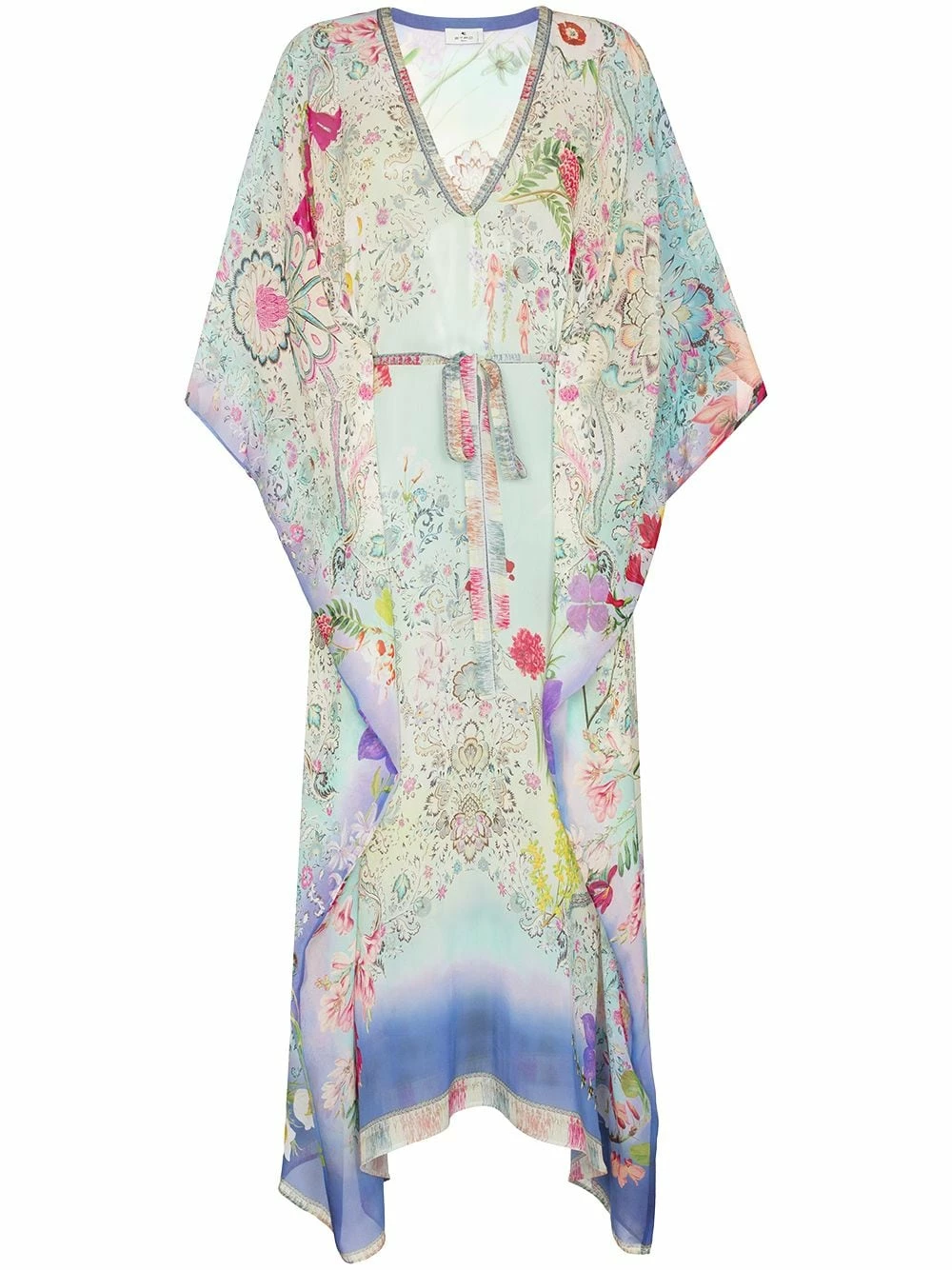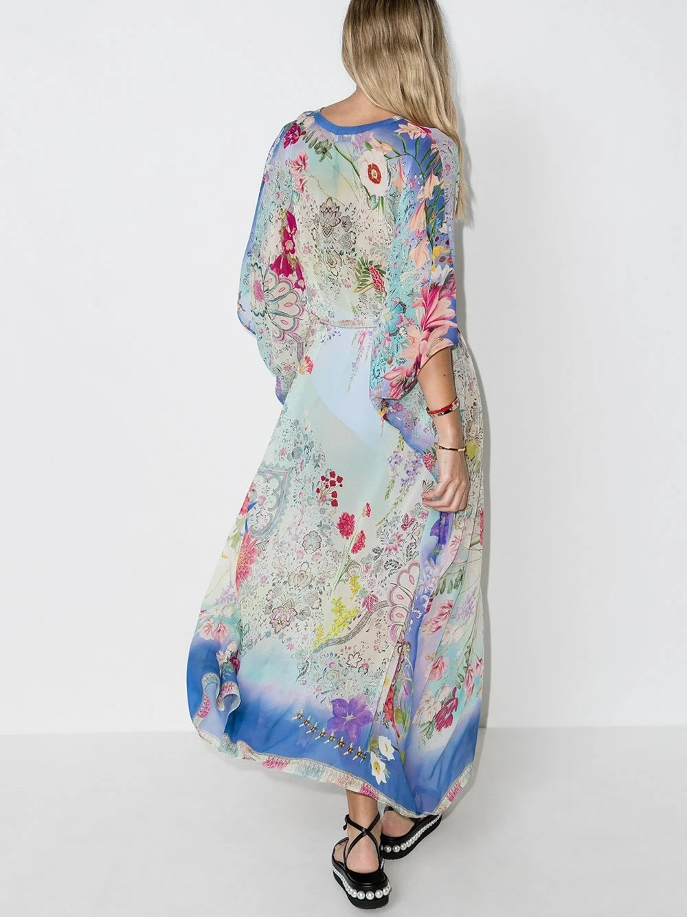 Motif de fleurs, structure légère, taille ceinturée, col v, design drapé, manches mi-longues, effet de transparence. Matière : soie.