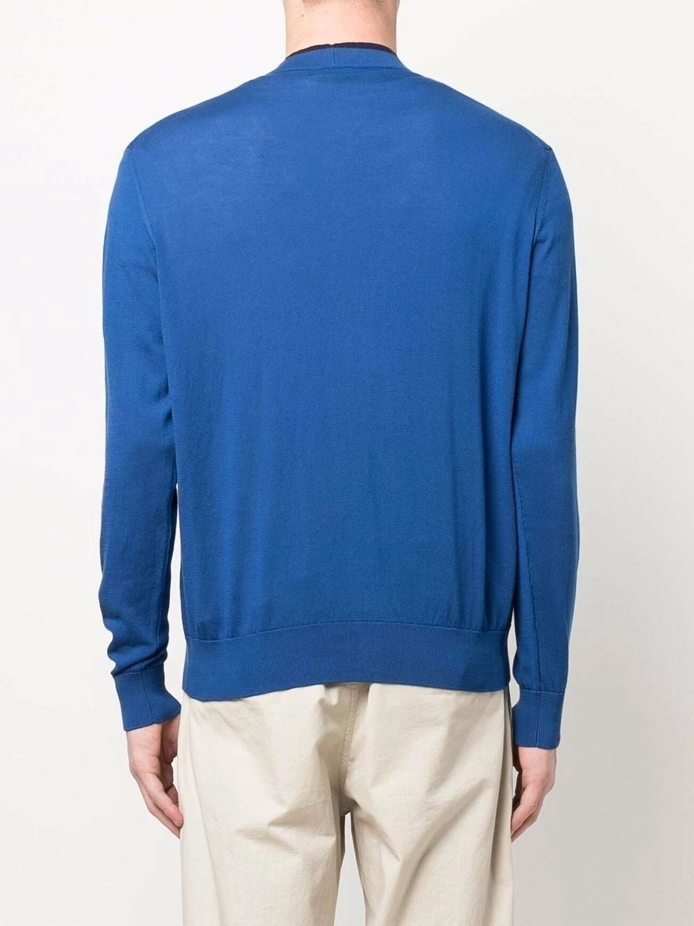 Logo brodé sur la poitrine, col v, fermeture boutonnée, manches longues, ourlet droit. Couleur : bleu. Matière : coton.