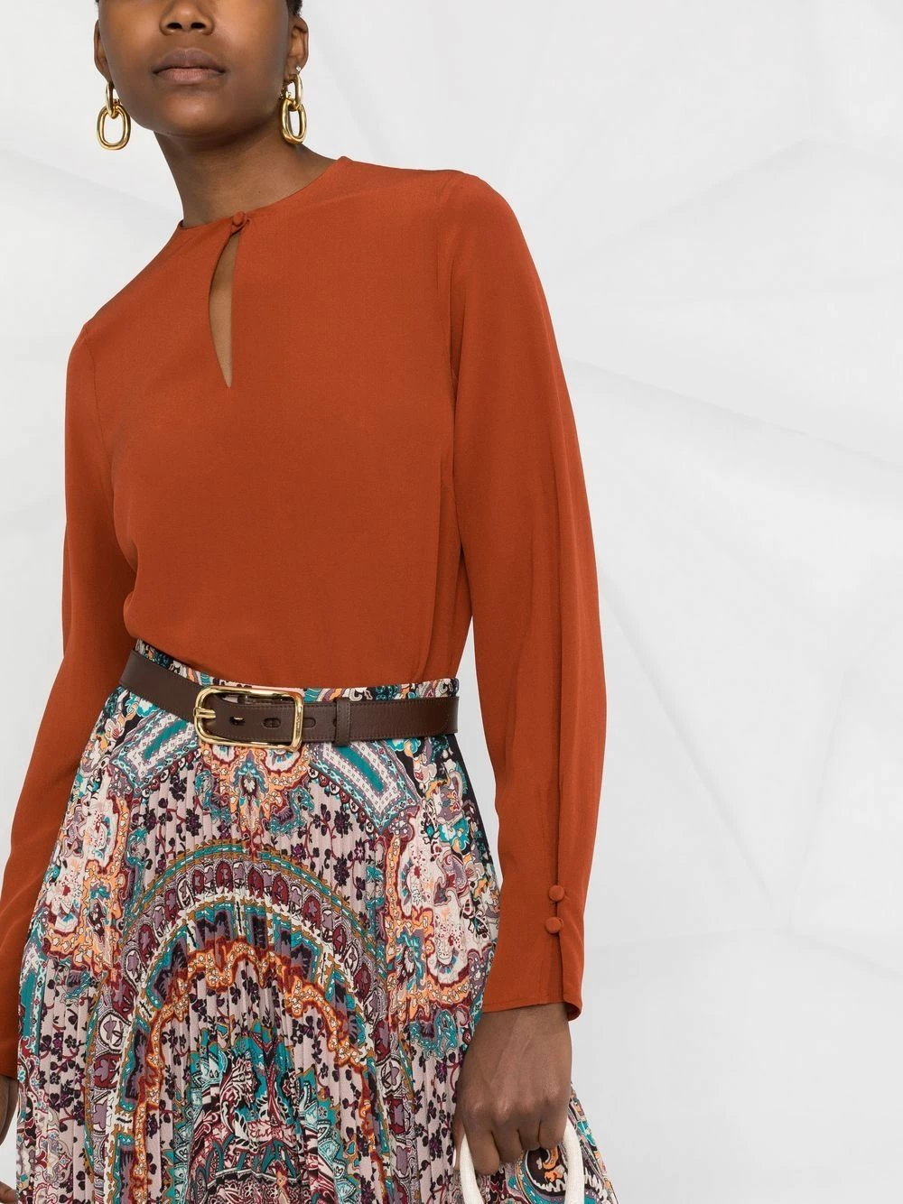 Col à ouverture goutte d’eau, boutonnière sur le devant, encolure ronde, manches longues. Couleur : orange. Matière : soie.