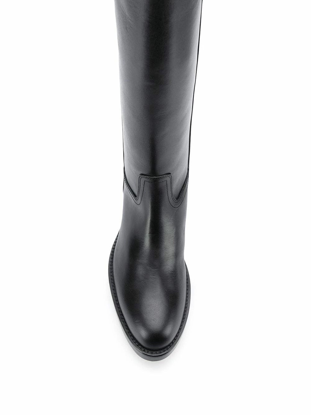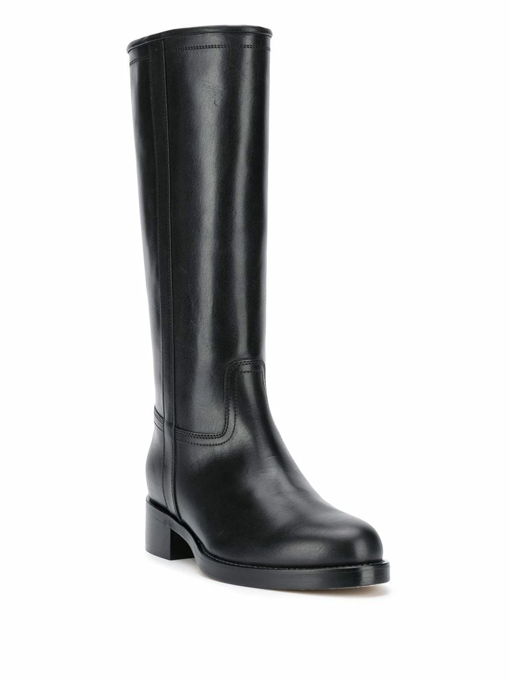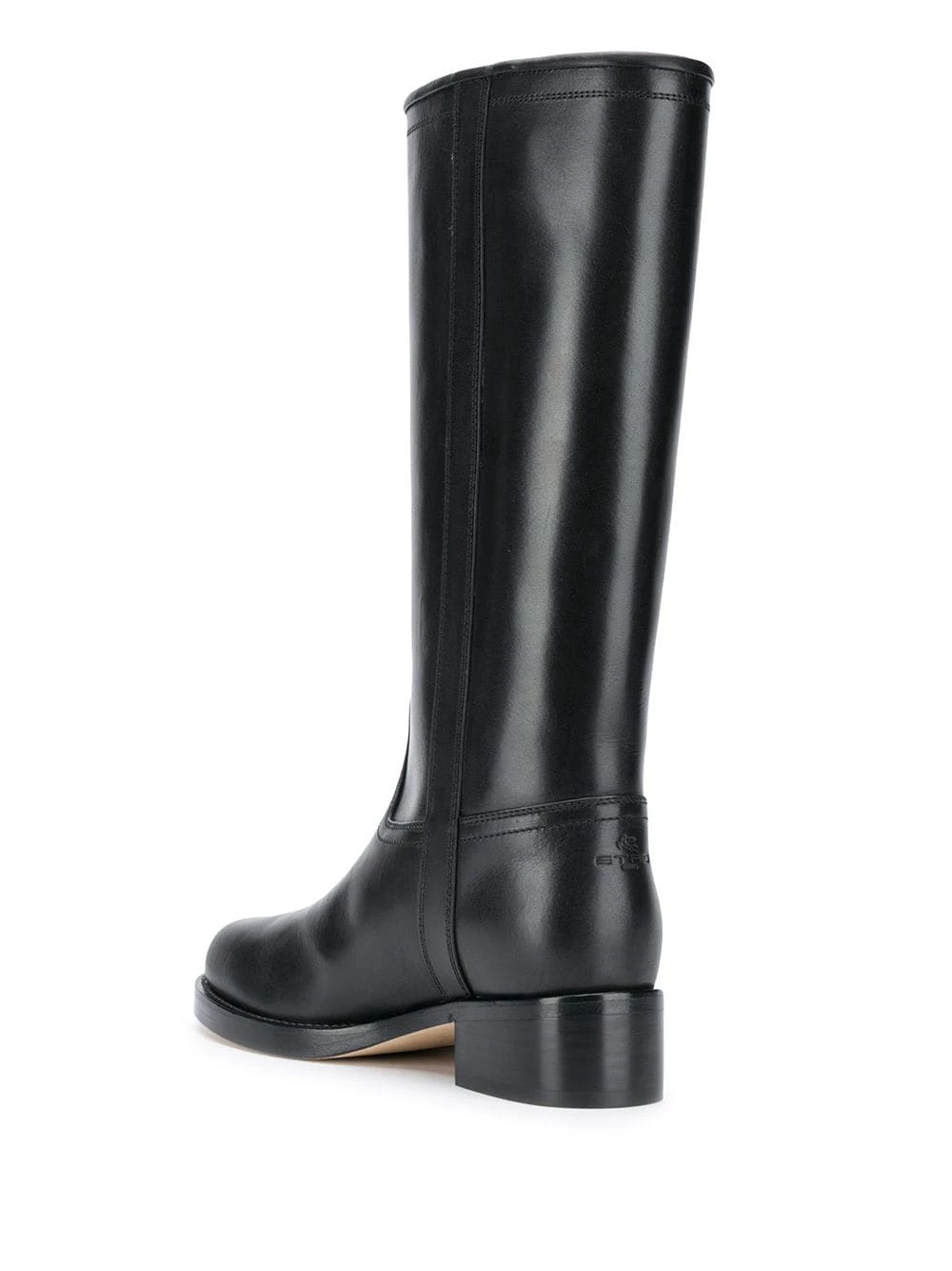 Hauteur genou, petit talon, bout en amande, ouverture à double languette. Couleur : noir. Matière : cuir.
