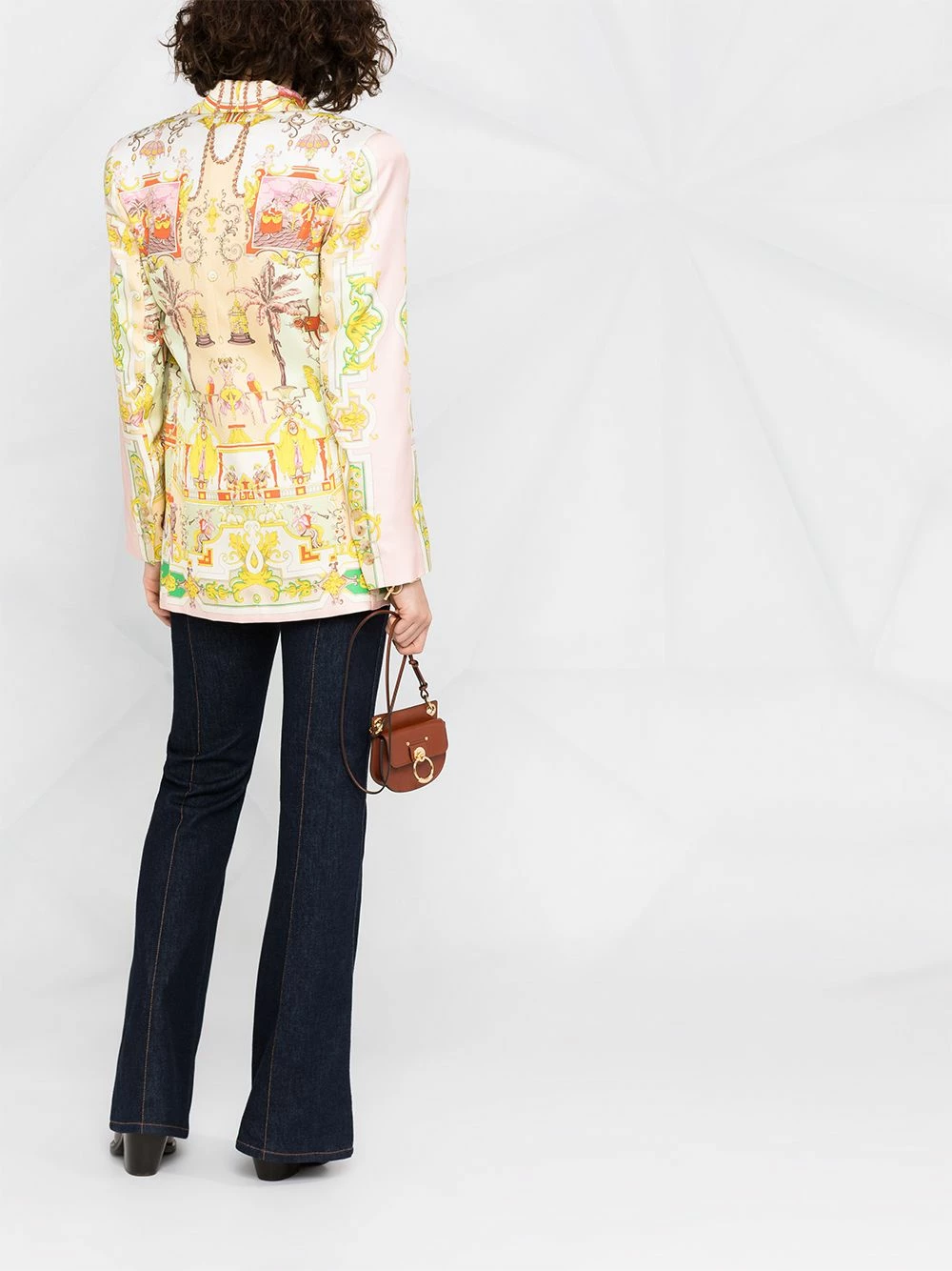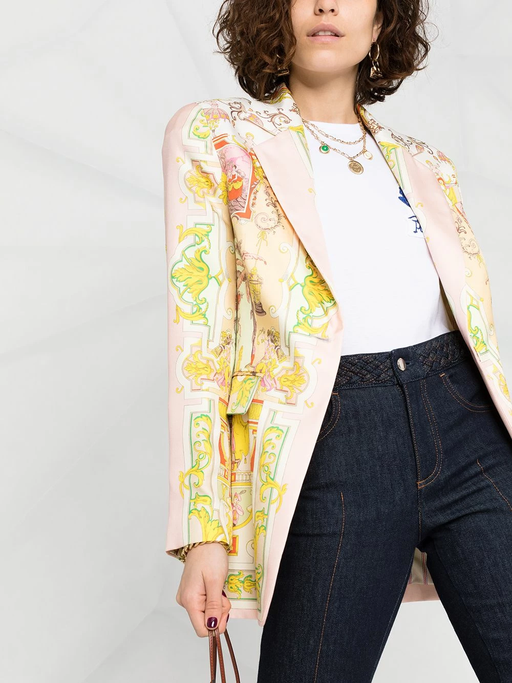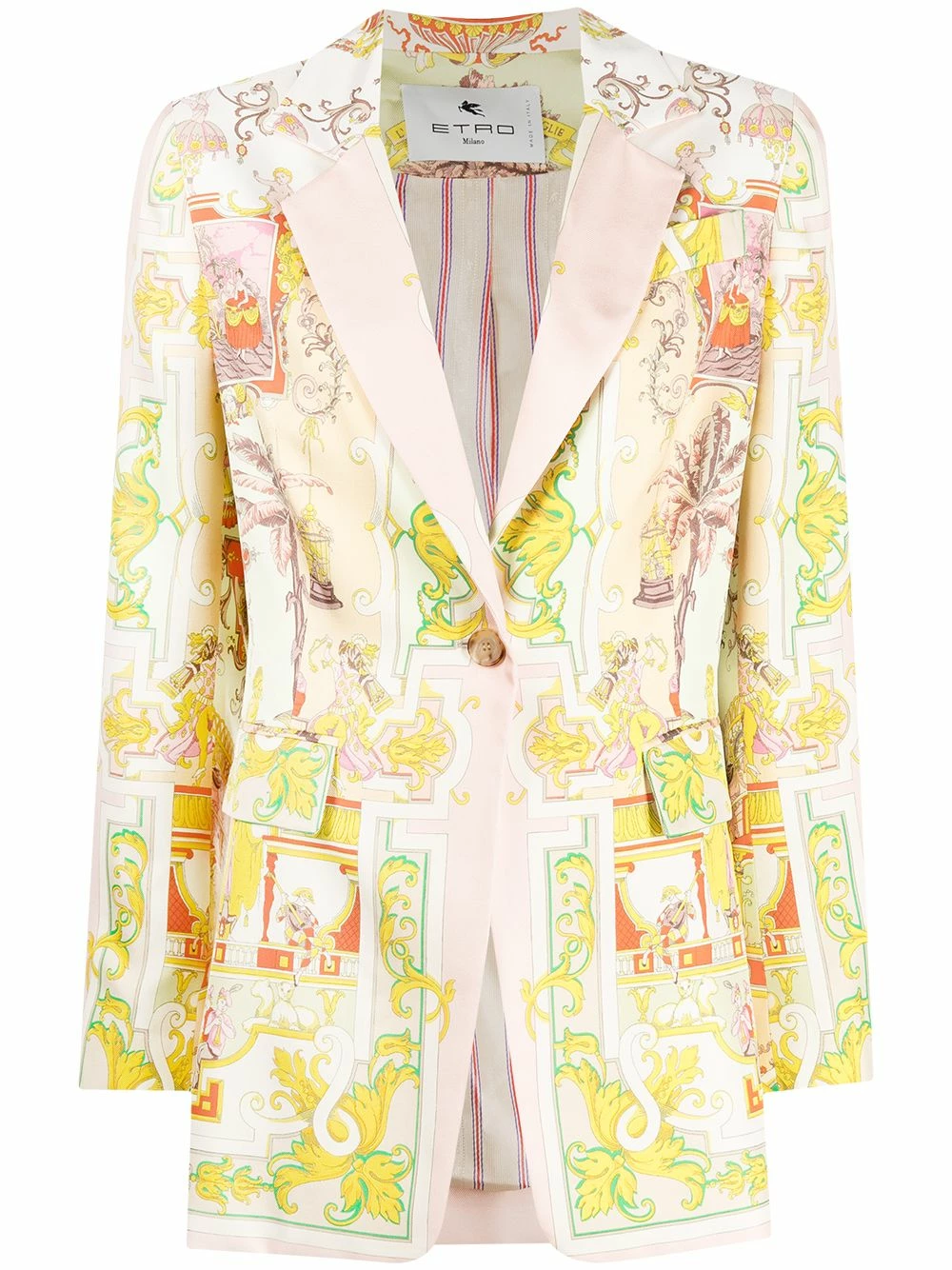 Motif baroque, revers crantés, boutonnière sur le devant, manches longues, poche poitrine passepoilée, deux poches plaquées avant, ourlet droit. Matière : soie.