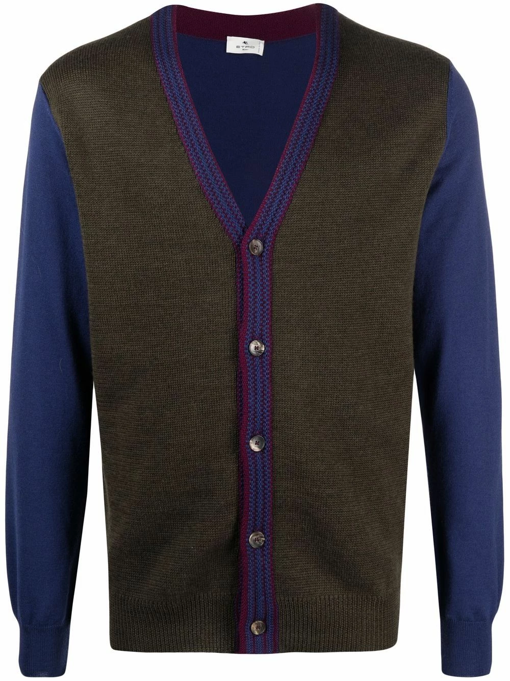 Empiècements contrastants, détail nervuré, col v, boutonnière sur le devant, manches longues, ourlet droit. Matière : laine vierge.