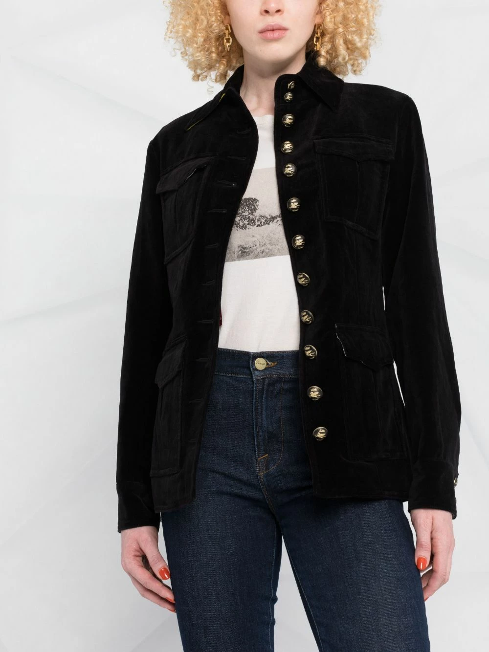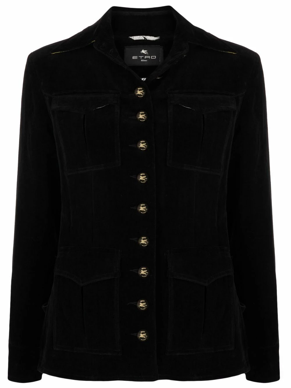 Boutonnière sur le devant, poches devant à rabat, col classique, manches longues, ourlet droit. Couleur : noir. Matière : coton.