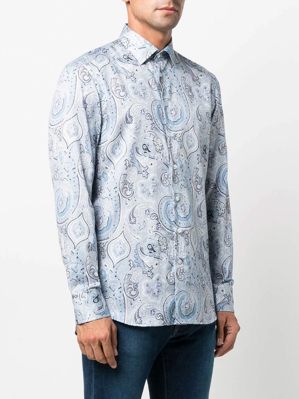 Motif cachemire, col classique, boutonnière sur le devant, manches longues, poignets boutonnés, ourlet incurvé. Couleur : bleu. Matière : coton.