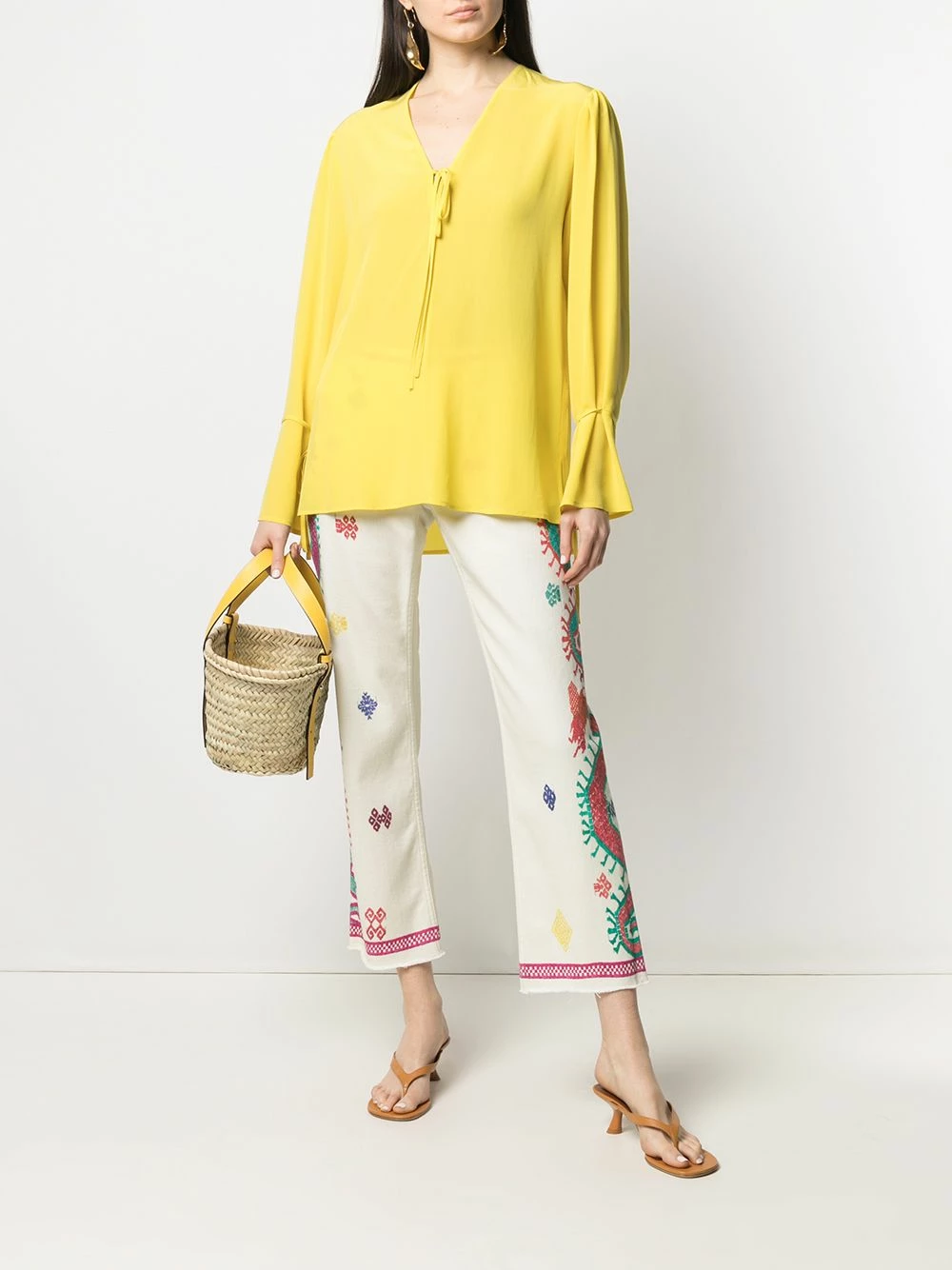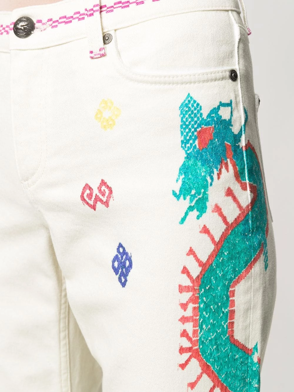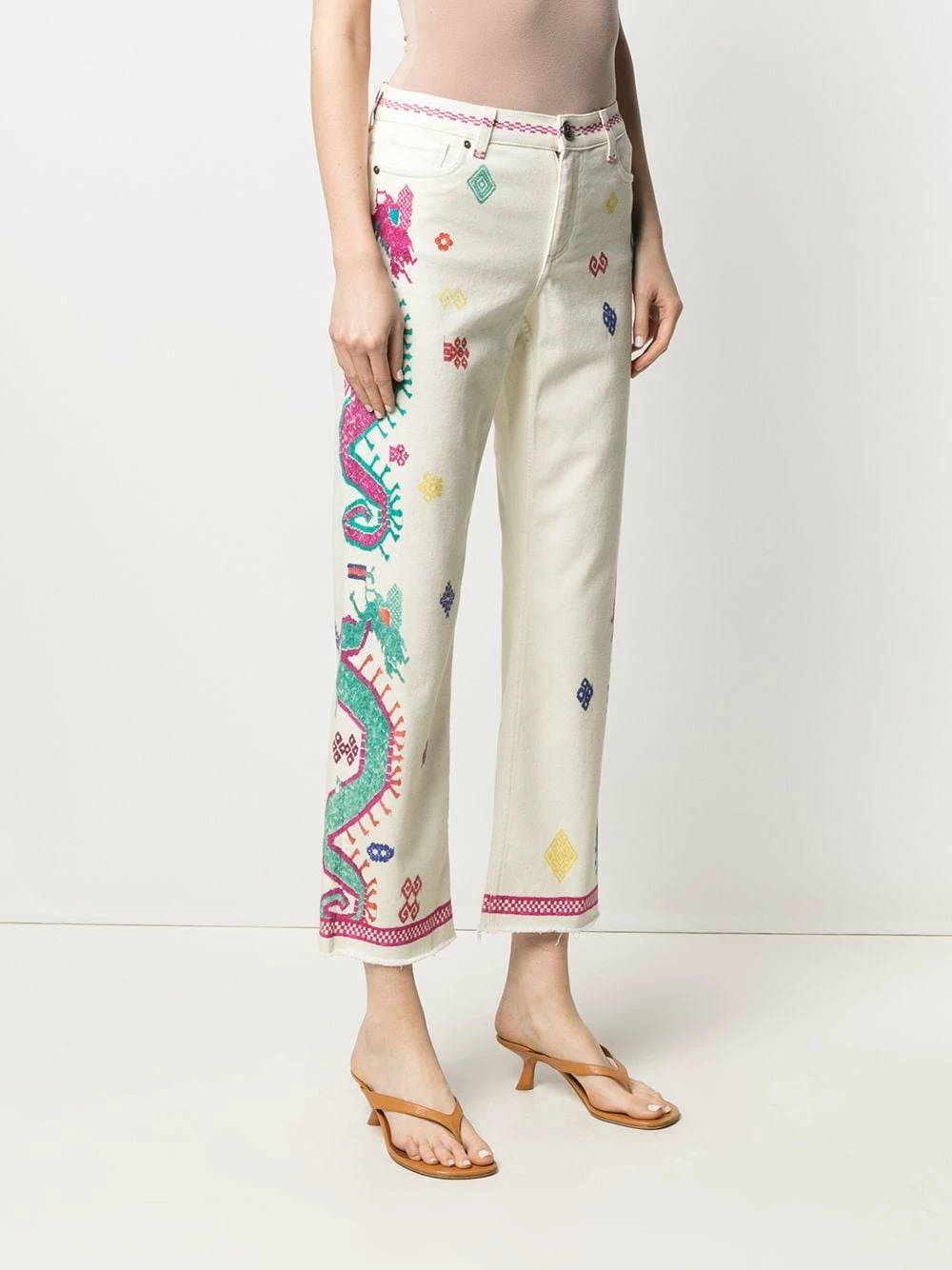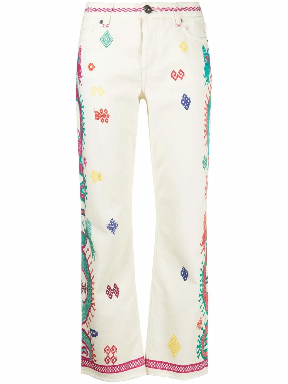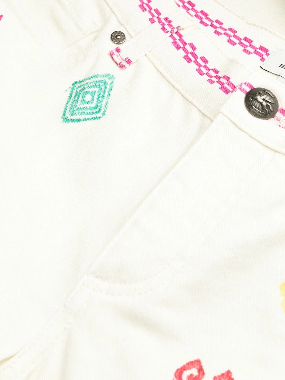 Broderies, coupe courte, fermeture boutonnée, passants de ceinture, 5 poches classiques.