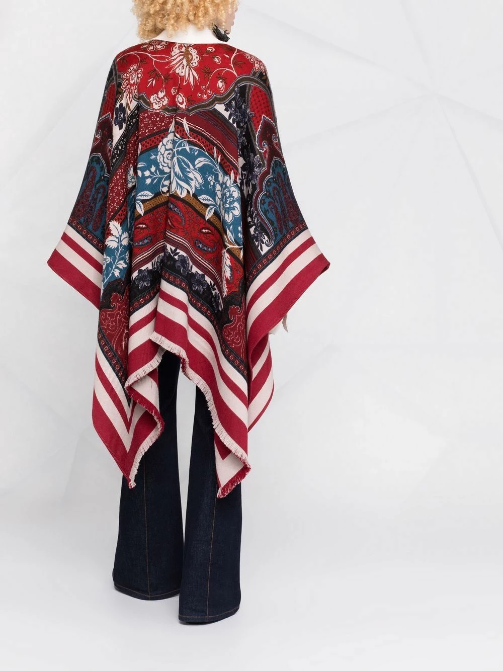 Motif cachemire, bords frangés, ourlet asymétrique, coupe longue. Couleur : rouge.