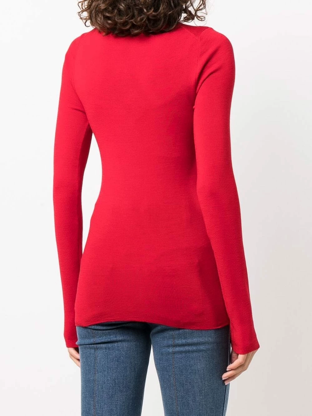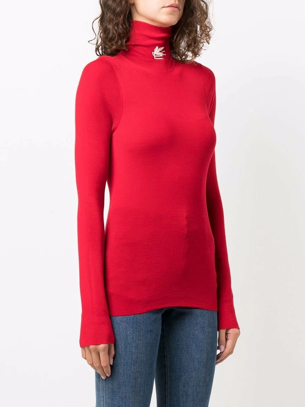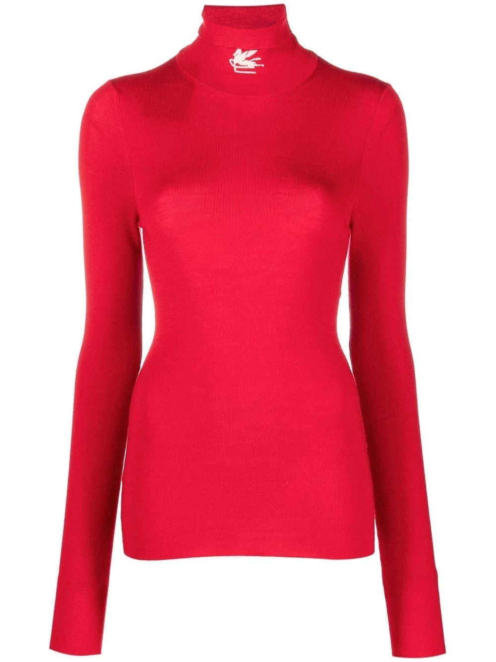 Imprimé monogrammé, col roulé, manches longues, ourlet droit. Couleur : rouge. Matière : laine.