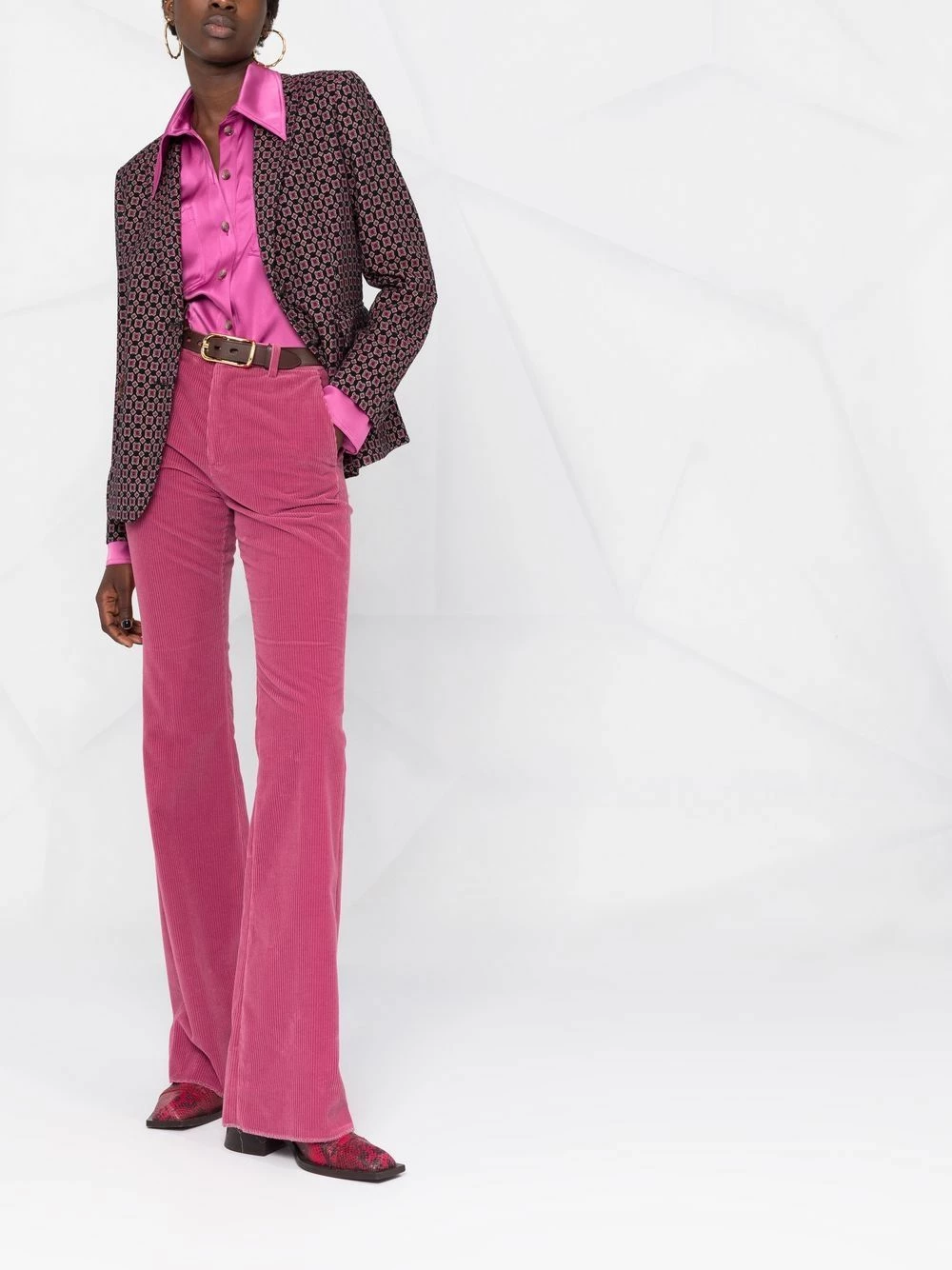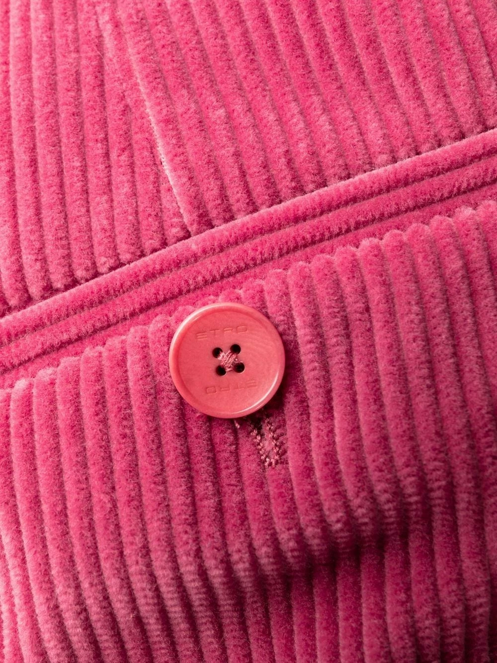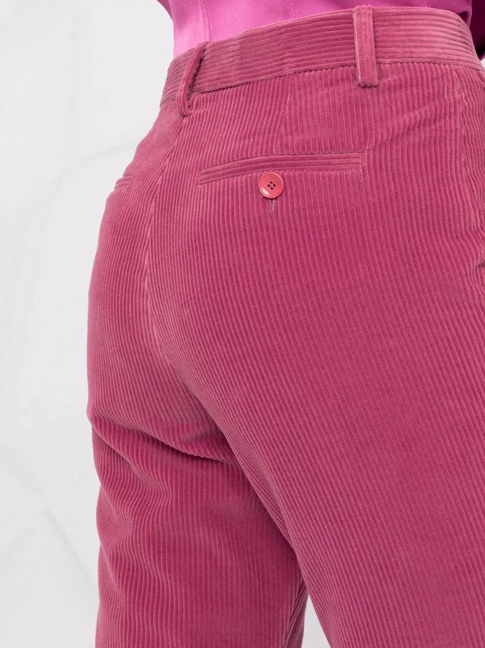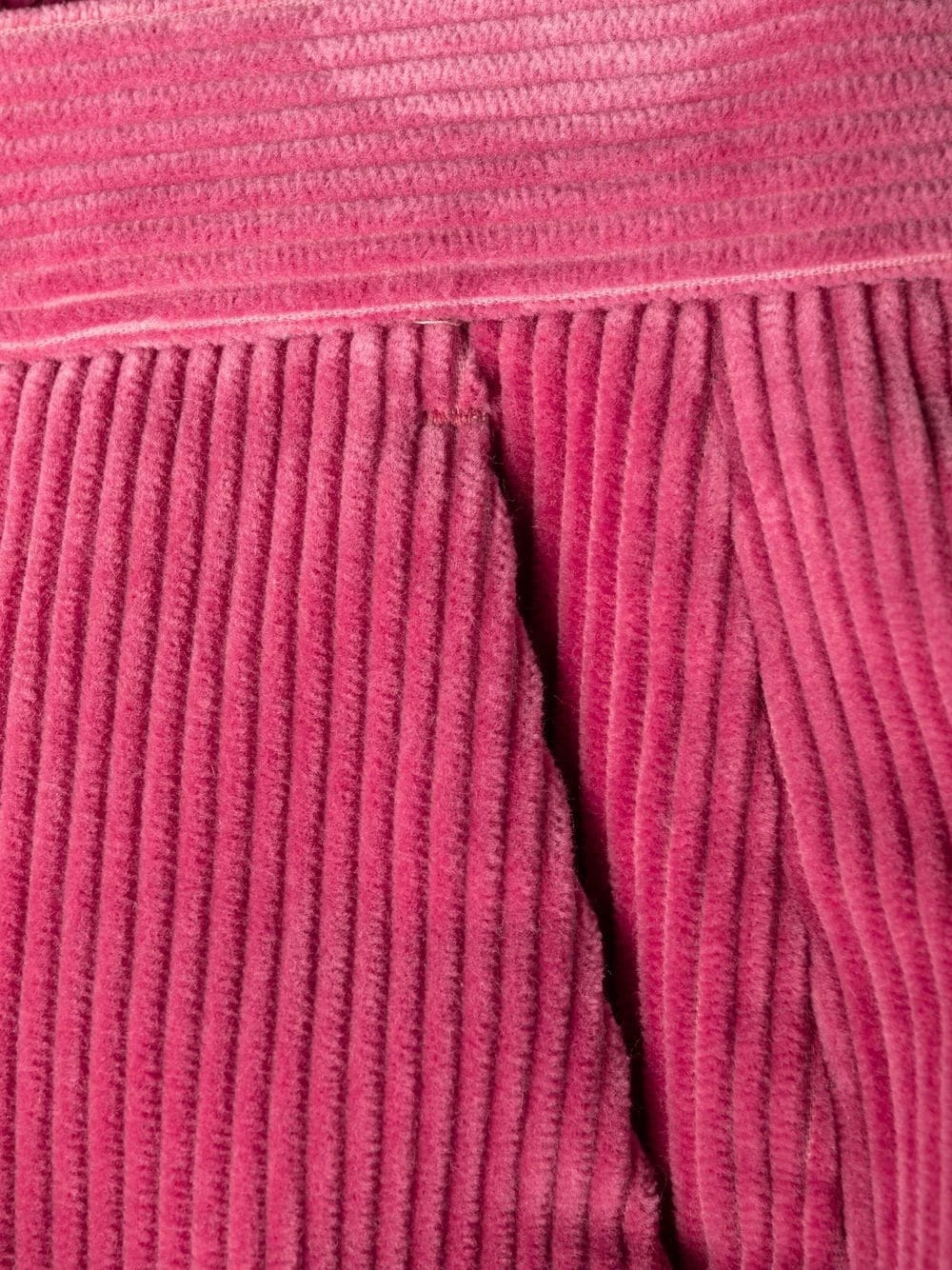 Design ton sur ton, velours côtelé, fermeture à zip et boutons sur le devant, passants de ceinture, deux poches latérales fendues, poches arrière passepoilées, coupe évasée. Couleur : rouge. Matière : coton.