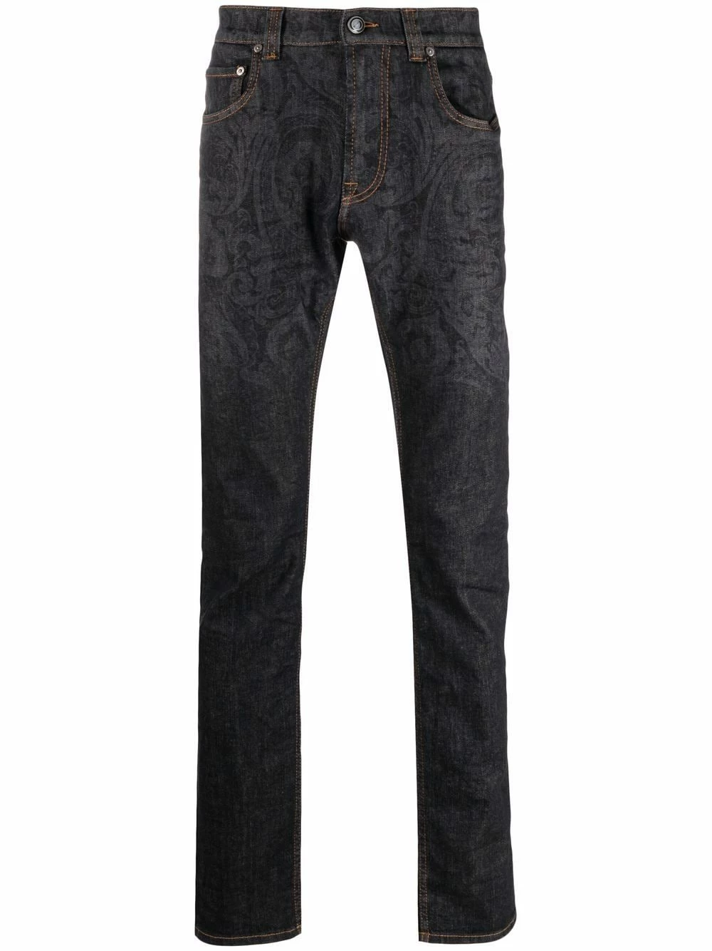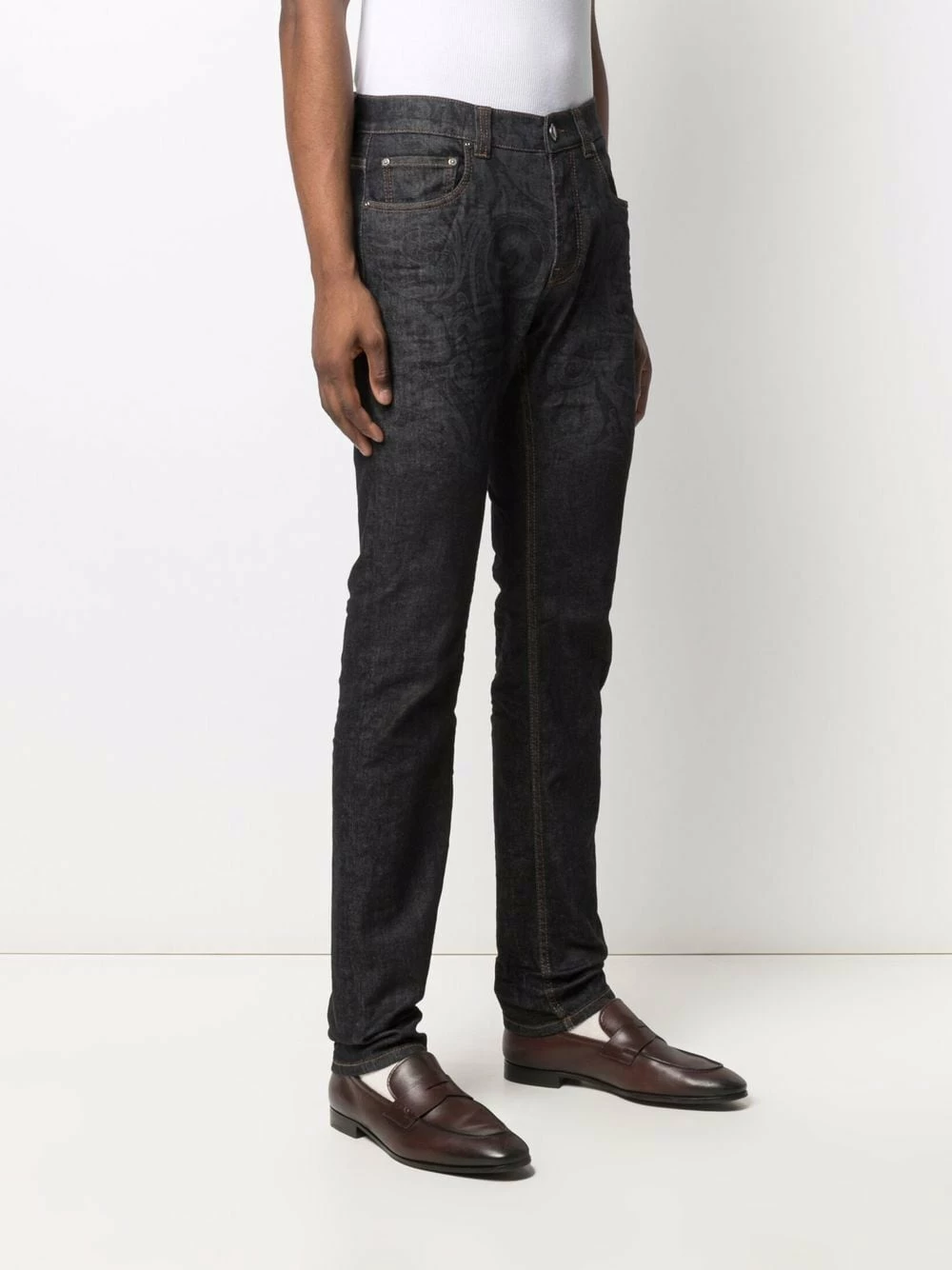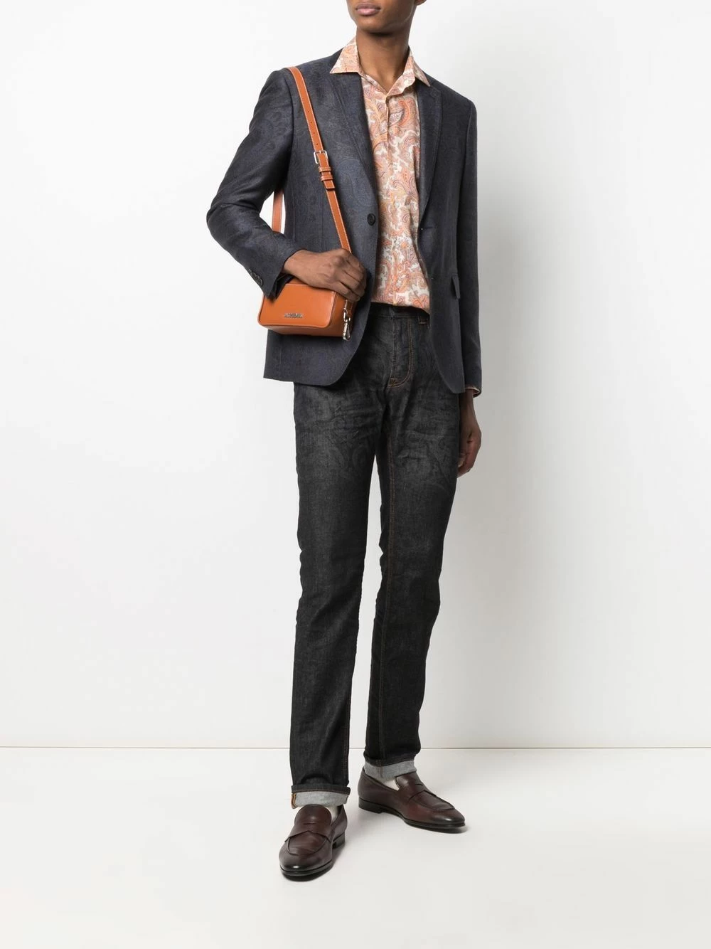 Motif cachemire, coutures contrastantes, taille mi-haute, fermeture boutonnée, passants de ceinture, cinq poches classiques, coupe droite.