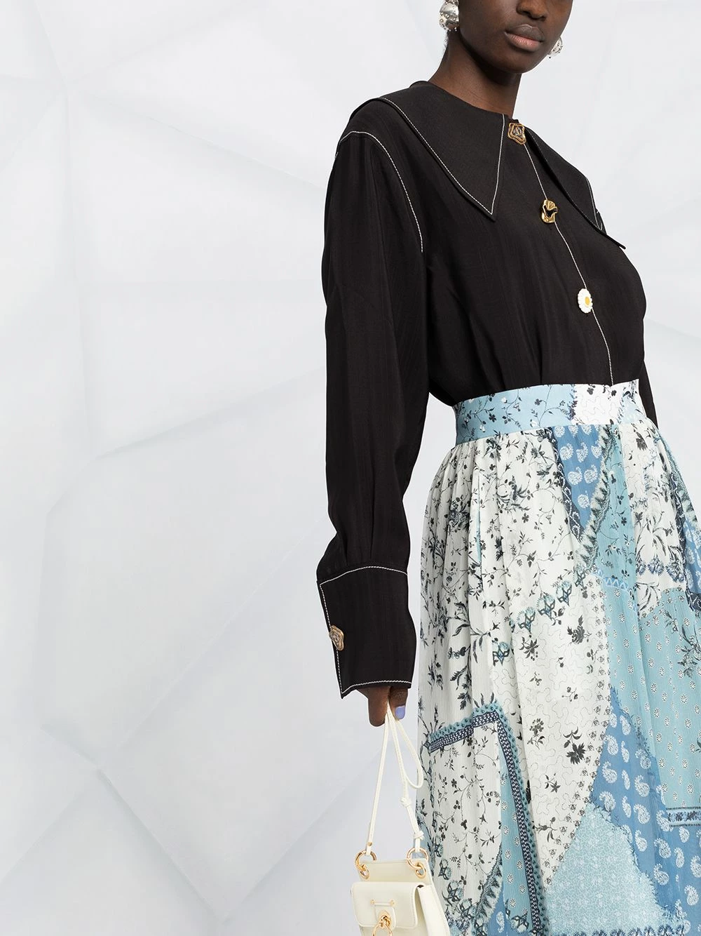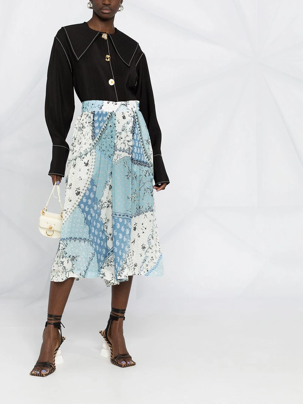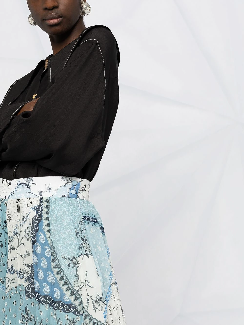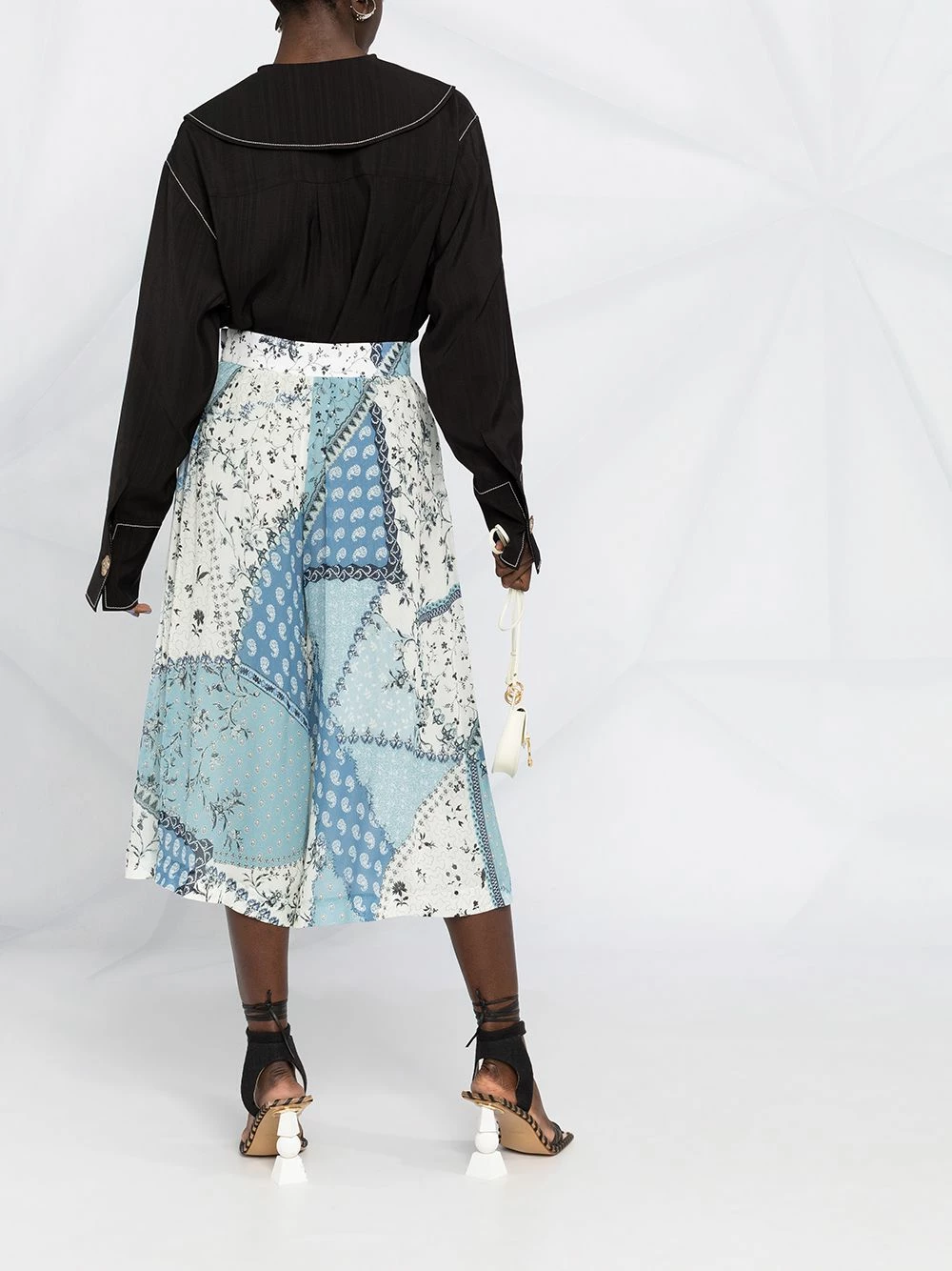 Imprimé façon patchwork, taille haute, coupe trapèze, deux poches latérales passepoilées, fermeture zippée dissimulée sur le côté.
