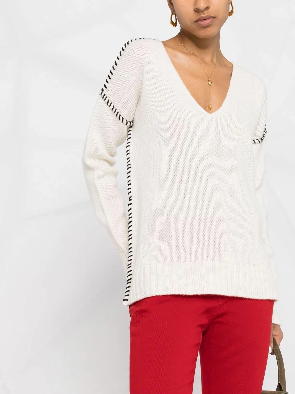 Coutures contrastantes, maille nervurée, col v, manches longues, finitions nervurées.