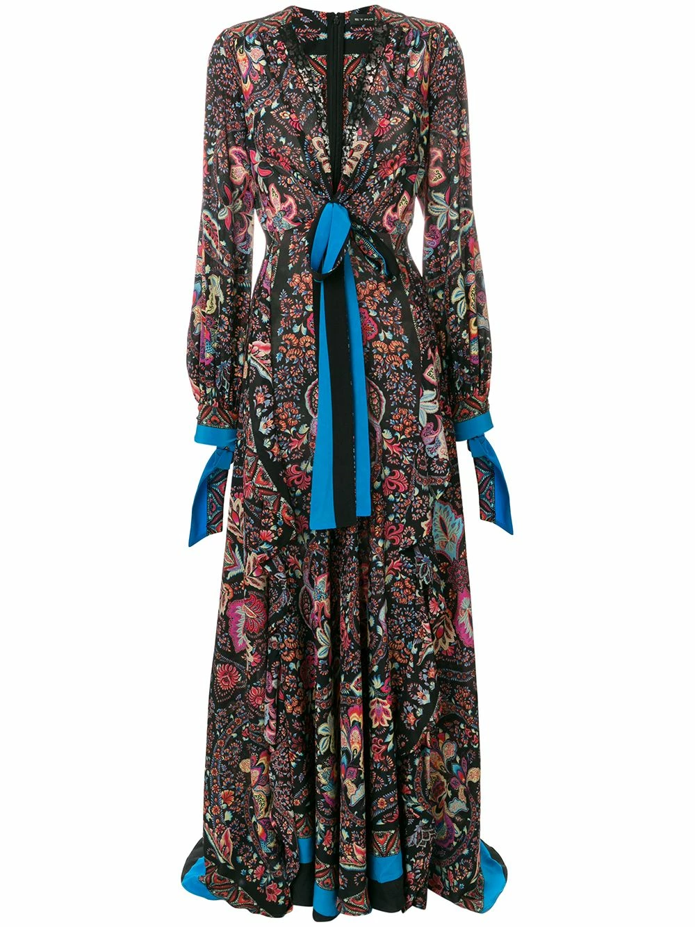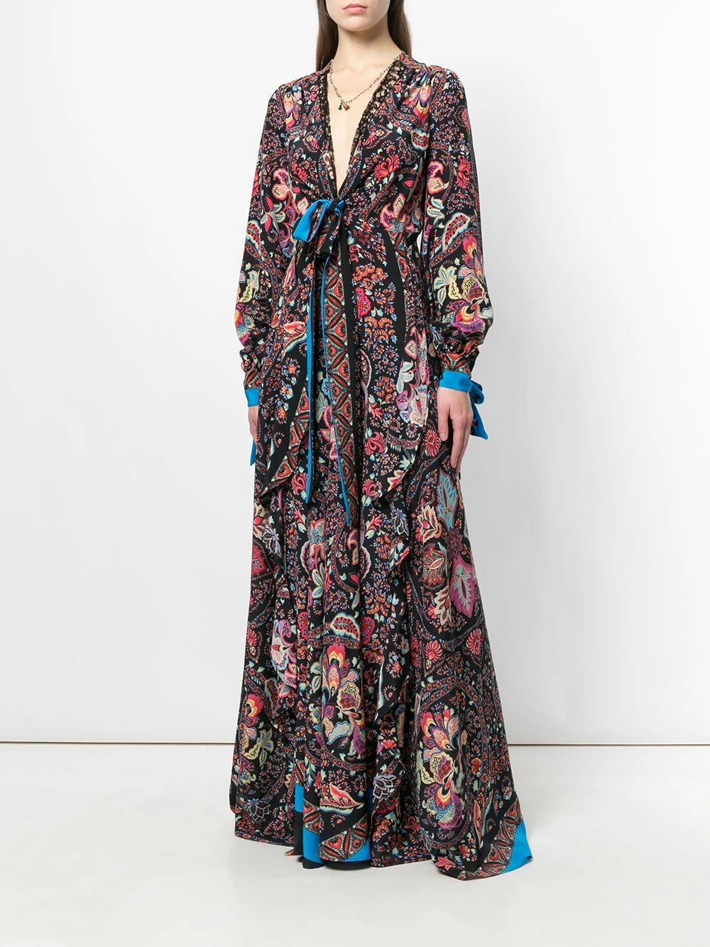 Robe longue imprimée en soie multicolore Etro avec col v profond, manches longues, coupe portefeuille et coupe longue.