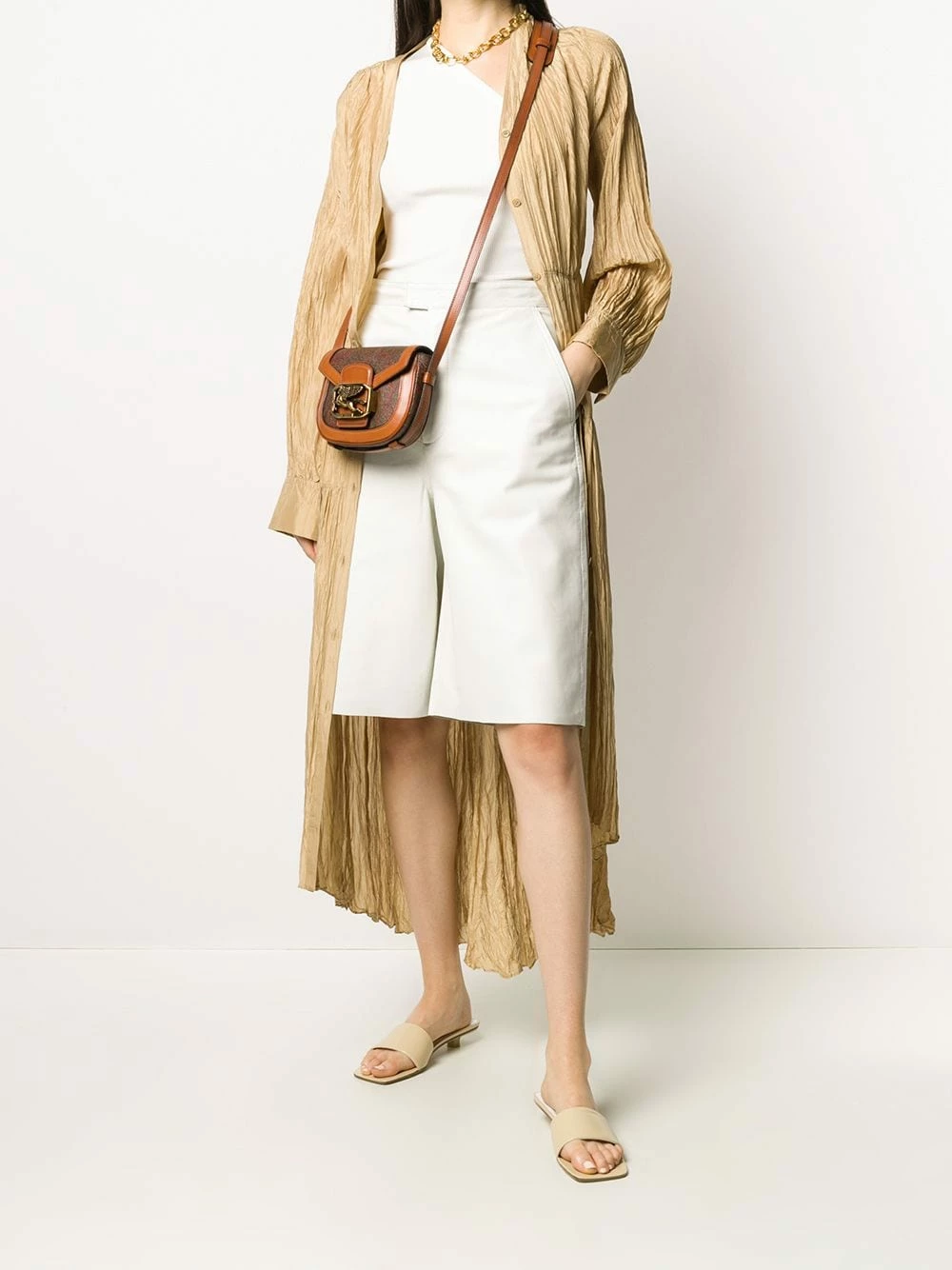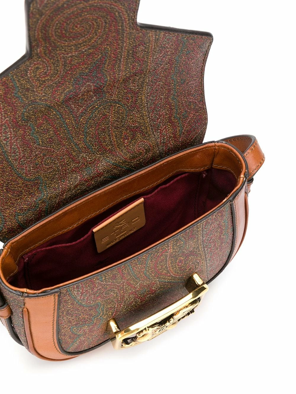 Motif cachemire, plaque logo dorée, liseré en cuir, rabat sur le dessus à fermeture magnétique, bride portée épaule ajustable, compartiment principal, poche arrière passepoilée, poche intérieure. Couleur : marron.