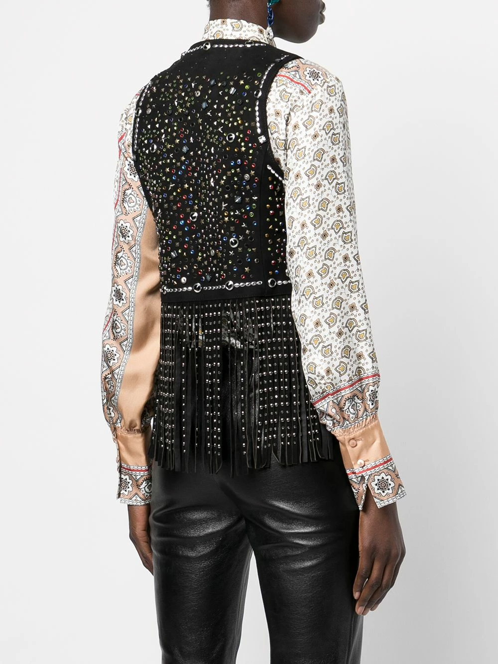 Finition à franges, détails de clous argentés, ornement en cristal, ornements en pierres précieuses, col v, fermeture dissimulée sur le devant, design sans manches. Couleur : noir.