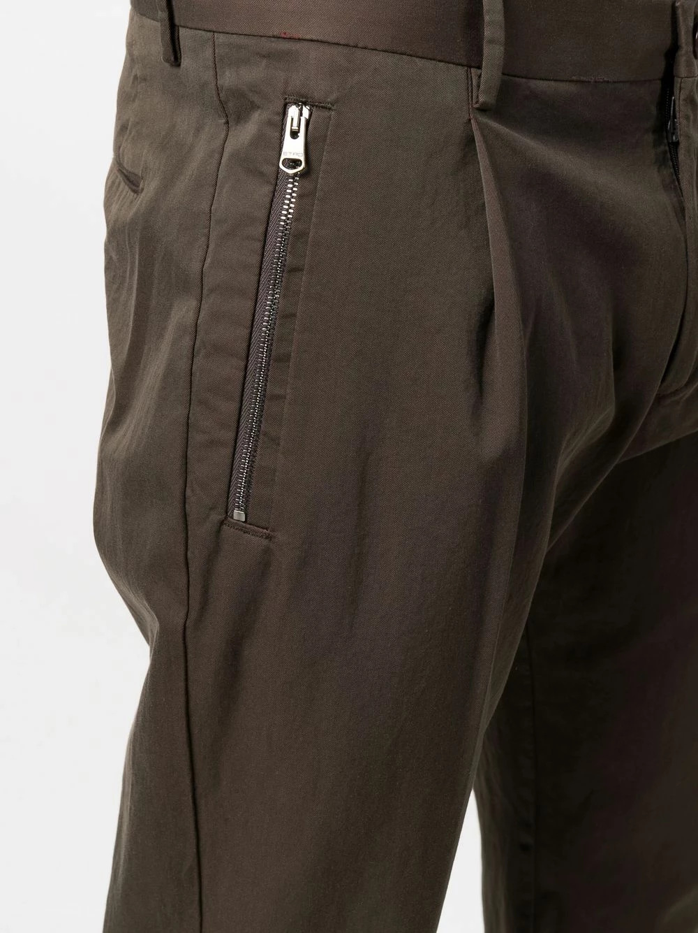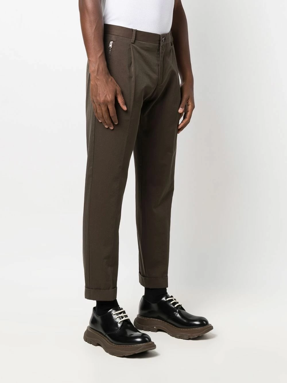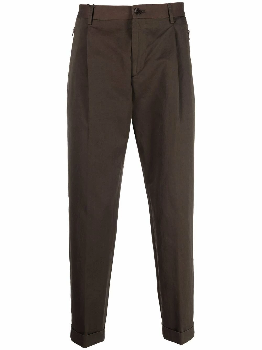 Passants de ceinture, fermeture à zip et boutons sur le devant, deux poches latérales zippées, poches arrière passepoilées, ourlet retroussé. Matière : coton.